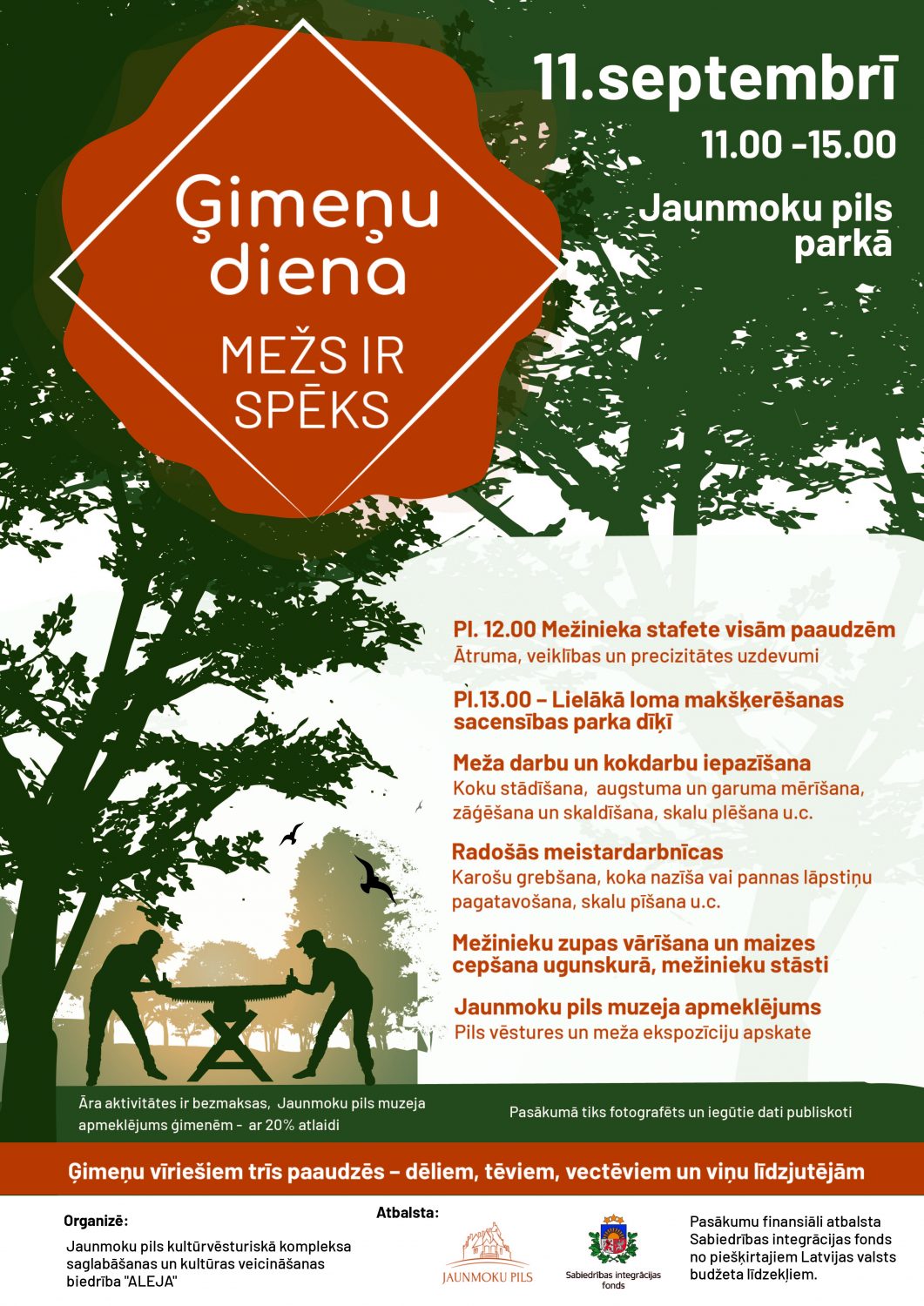 Tēvu dienu atzīmēt būs iespējams arī svētdien. Tā, noslēdzot piecu pasākumu ciklu, 11.septembrī no 11.00 līdz 15.00 ģimeņu vīrieši trīs paaudzēs – dēli, tēvi, vectēvi, kā arī viņu līdzjutējas ir aicināti uz Ģimeņu dienu “Mežs ir spēks” Jaunmoku pils parkā. No 12.00 norisināsies Mežinieku stafete, kurā visi ģimeņu paaudžu vīrieši un viņu līdzjutējas varēs pārbaudīt sevi un izaicināt viens otru sacensties ātrumā, precizitātē, veiklībā;13.00 notiks Lielā loma makšķerēšanas sacensības parka dīķī, izmantojot seno laiku makšķerkātus; no 11.00 līdz 15.00 varēs praktiski izzināt tādus meža darbus kā koku stādīšanu, koku augstuma un garuma mērīšanu, zāģēšanu un skaldīšanu, skalu plēšanu un koku sugu noteikšanu. Tāpat radošajās meistardarbnīcās būs iespēja grebt karotes, mācīties pagatavot sviesta nazīti vai pannas lāpstiņu, pīt skalu grozu vai gatavot dekoru. Un, klausoties mežinieku stāstos un daloties pieredzē, varēs cept maizi ugunskurā un baudīt mežinieku zupu.