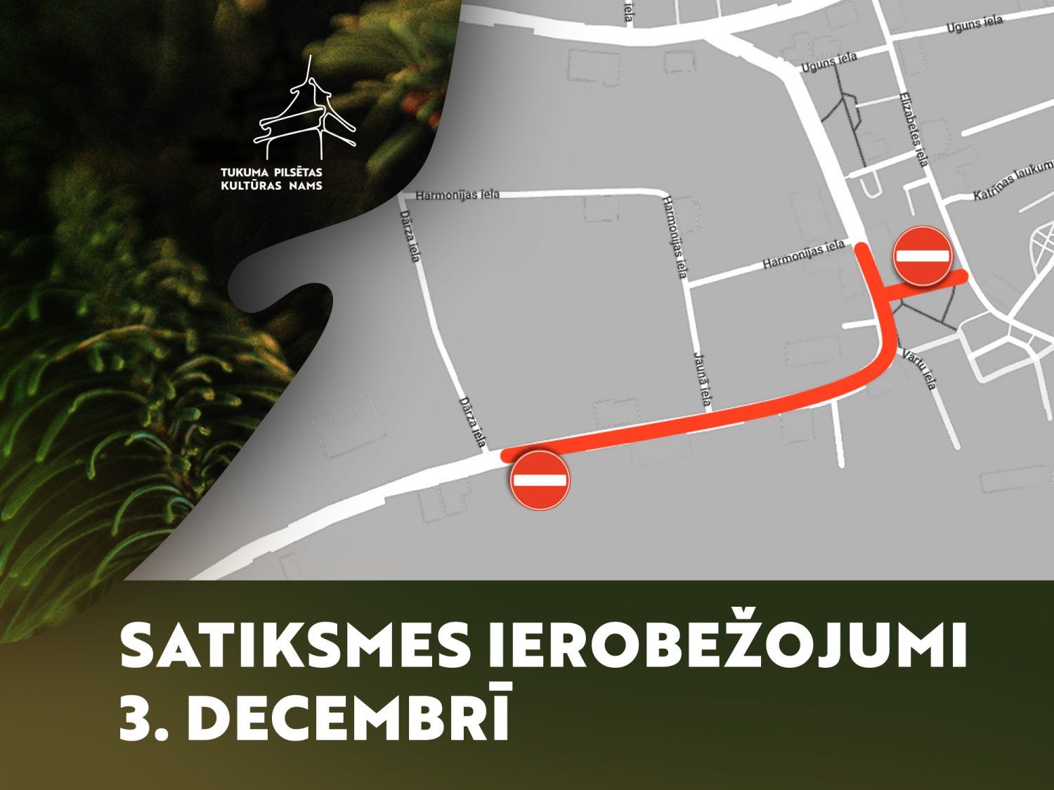 Piektdien, 1. decembrī no 17.00 Lielā iela posmā no Dārza ielas līdz Harmonijas ielai un Brīvības laukums gar «Kafe Terase» būs slēgti autotransporta kustībai.