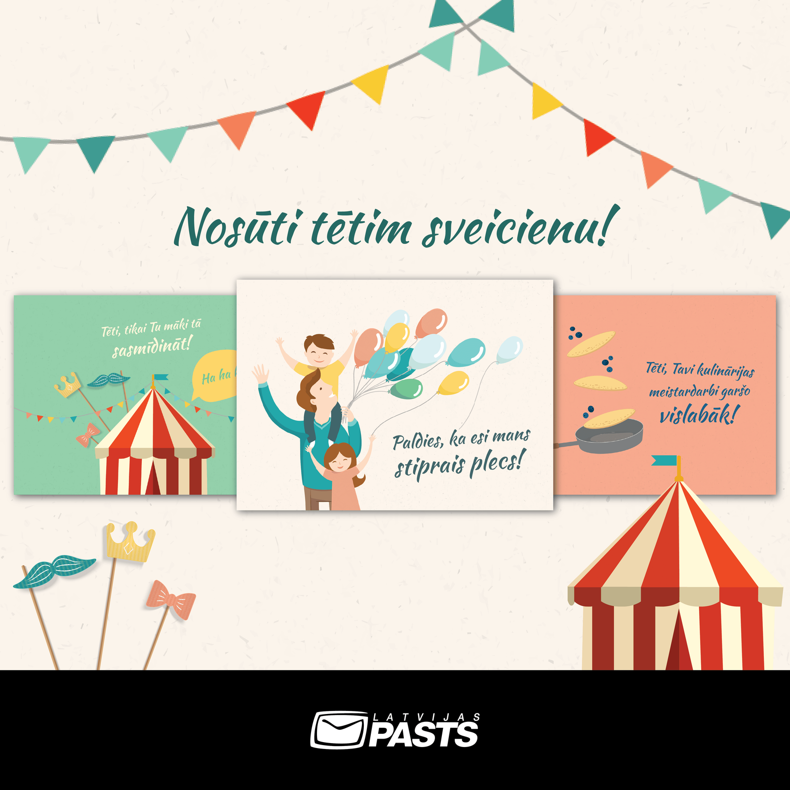 Latvijas Pasts un Latvijas vecāku organizācija Mammamuntetiem.lv arī šogad aicina sumināt tētus ar īpašu sveicienu Tēva dienā, nosūtot kādu no Latvijas Pasta sagatavotajām pastkartēm, kurās izceltas tētu sevišķās prasmes – sasmīdināt, pagatavot visgardākos ēdienus un būt atbalstam visās dzīves situācijās. Izvēloties kādu no trim pastkaršu dizaina variantiem interneta vietnē www.nosutipastkarti.lv un precīzi aizpildot norādītos adreses laukus, pastkartes tiks piegādātas adresātiem Latvijas teritorijā līdz Tēva dienai, ko Latvijā šogad atzīmēs 13.septembrī.