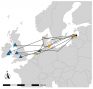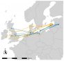 Mājas strazds, atšķirībā no mežastrazdiem, pieder citai putnu dzimtai un dabā ligzdo koku dobumos (mežastrazdi – atklātās ligzdās) un tādēļ tos viegli piesaistīt, izliekot piemērota izmēra būrīšus. Ģeolokatori ir datu uztvērēji, kas kā mazas (~1,5g) mugursomiņas piestiprinātas putnam uz muguras un reģistrē dažādus parametrus (gaismas intensitāti, gaisa spiedienu, relatīvo paātrinājumu un gaisa temperatūru). Pēc šiem parametriem var spriest par putna atrašanās vietu un uzvedību ceļošanas un ziemošanas laikā. Šī metode balstās uz to, ka ģeolokators pētniekiem ir jāatgūst – tas datus nenoraida (jo noraidīšanas iespēja – baterija, padarīto ierīci pārāk smagu, lai putnus to varētu panest), bet tikai uzkrāj. Lai iegūtu datus, zinātniekiem putns ir jānoķer otrreiz un uztvērējs jānoņem. Viena no divām mūsu pētījumu vietām ir Engures ezera Ornitoloģisko pētījumu centrs un teritorija ap Engures ezeru (otra vieta atrodas Gulbenes novadā). Pētnieki, protams, pētījumu parauglaukumā arī šogad turpinās pētījumu, taču nav izslēgts, ka kāds mājas strazds varētu izvēlēties ligzdot arī kaimiņu novados. Tādēļ ir ļoti liels lūgums ziņot mūsu pētniekiem Viesturam Vīgantam (viesturs.vigants@lu.lv; 22377639) vai Ivo Dinsbergam (26793192) par novērotiem mājas strazdiem ar krāsainu gredzenu uz kājas. Mēs būsim ļoti pateicīgi par katru šādu ziņojumu.