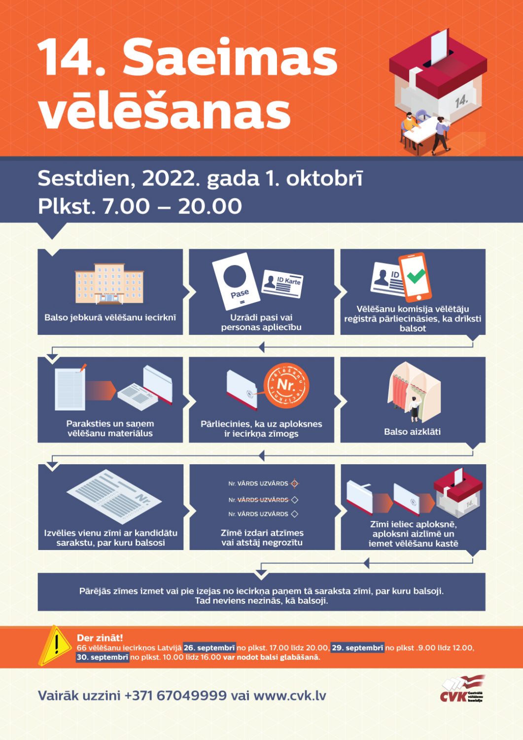 Sestdien, 2022. gada 1. oktobrī, notiks 14. Saeimas vēlēšanas, kurās uz nākamajiem četriem gadiem būs jāievēl 100 parlamenta deputāti. Vēlēšanu dienā vēlēšanu iecirkņi Latvijā un ārzemēs vēlētājiem būs atvērti no pulksten 7.00 līdz 20.00 pēc vietējā laika. Kā līdz šim balsot varēs jebkurā vēlēšanu iecirknī.