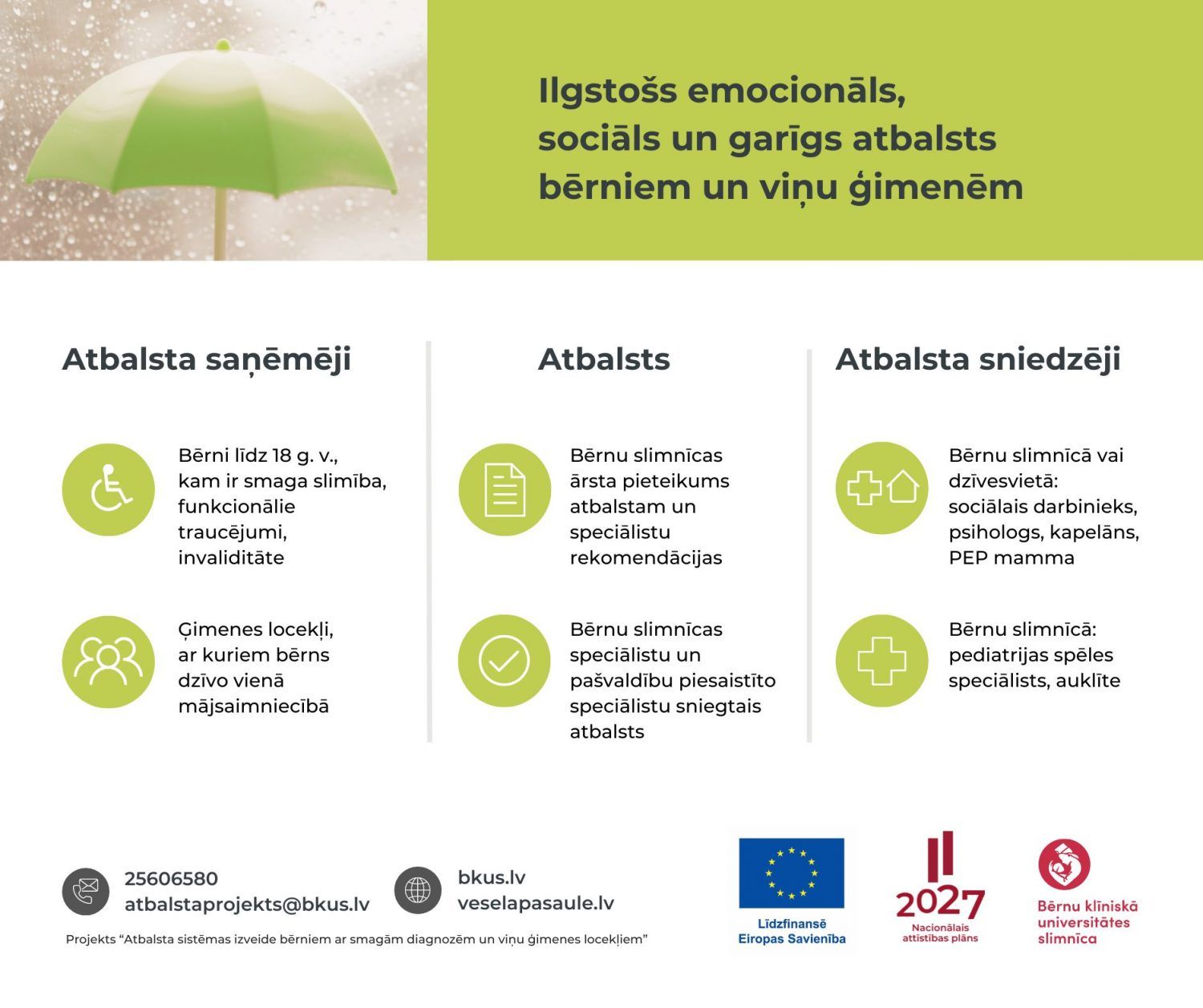 Bērnu slimnīca uzsākusi vērienīgu projektu, kas sniedz iespējas līdz 2027. gada vidum ne tikai Bērnu slimnīcā, bet arī bērna dzīvesvietā, sadarbojoties ar pašvaldību sociālajiem dienestiem, nodrošināt ģimenēm ilgstošu emocionālu, sociālu un garīgu atbalstu. Atbalsta veidus un apjomu bērniem ar smagām slimībām un viņu ģimenēm rekomendē, nodrošina un koordinē Bērnu slimnīcas speciālisti.