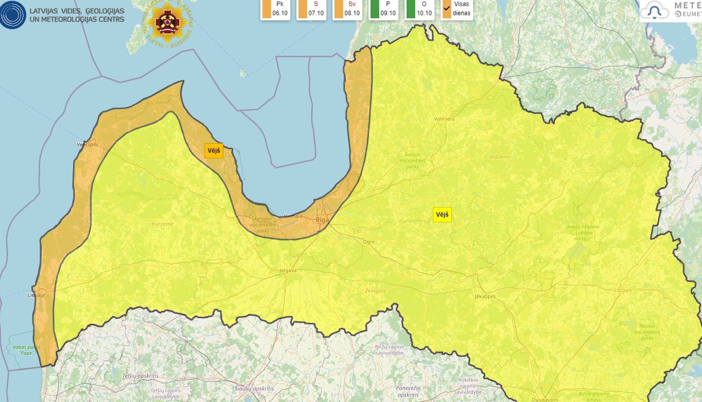 Piektdien vakara stundās pastiprināsies mērens, mēreni stiprs dienvidu, dienvidrietumu vējš, brāzmās sasniedzot 17-22 m/s, piekrastē pat 25-28 m/s. Sestdien vējš iegriezīsies no rietumiem, ziemeļrietumiem un visā teritorijā saglabāsies stiprs un brāzmains līdzīgi kā naktī uz sestdienu, bet svētdien vēja brāzmas vietām varētu būt vēl spēcīgākas, piekrastes rajonos sasniedzot pat 30 m/s. Vēja pierimšana valsts lielākajā daļā gaidāma svētdien vakarā, vien piekrastes rajonos brāzmains vējš saglabāsies līdz pirmdienas dienas vidum.Līdz ar stipro vēju līča piekrastē gaidāmi arī vējuzplūdi – visvairāk ūdens līmenis paaugstināsies Rīgas līča dienvidos – par 1-1,2 m. Atsevišķos rajonos lietus dēļ var applūst arī zemākās vietas.Naktī uz sestdienu minimālā temperatūra gaidāma nakts sākumā: gaiss atdzisīs tikai līdz +7…+14°, pēc tam nakts gaitā tā paaugstināsies, un maksimālā temperatūra gaidāma rīta stundās, dienas laikā jau Latvijā ieplūdīs vēsāks gaiss un temperatūra pazemināsies. Savukārt gan svētdien, gan pirmdien naktīs termometra stabiņš noslīdēs līdz +1…+6° atzīmei, bet vietām zāles virskārtā veidosies salna 0…-2°, vien jūras piekrastē gaiss būs par dažiem grādiem siltāks. Arī dienā nebūs siltāks par +6…+10°, austrumu rajonos svētdien pat +4…+6°.