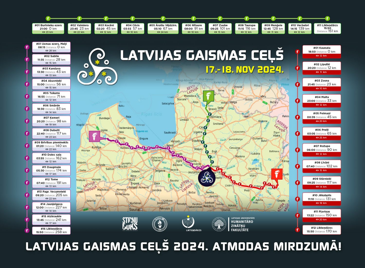 “Latvijas Gaismas ceļš” būs spēku rosinošs un garu stiprinošs simbolisks skrējiens, kurā aicināts piedalīties ikviens Latvijas iedzīvotājs. Trīs ceļa posmi no trīs dažādām Latvijas vietām būs sadalīti aptuveni 10 līdz 20 kilometru distancēs, katru no tiem veiks 3 tempa uzturētāji, kuri nogādās starta vietā aizdegto lāpu nākošajā distances posmā, katrā no tiem aizdedzot ugunskuru.