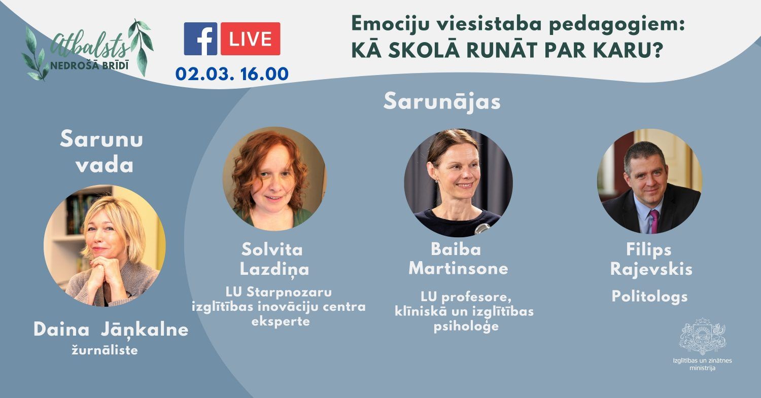 Trešdien, 2. martā, 16.00 Izglītības un zinātnes ministrija (IZM) aicina pedagogus un vecākus uz tiešsaistes sarunu ciklā “Emociju viesistaba”.  Vebināra tēma - kā skolā runāt par karu. Sarunā piedalīsies Latvijas Universitātes (LU) Starpnozaru izglītības centra eksperte Solvita Lazdiņa, LU profesore, klīniskā un izglītības psiholoģe Baiba Martinsone un politologs Filips Rajevskis. Sarunu vadīs žurnāliste Daina Jāņkalne.