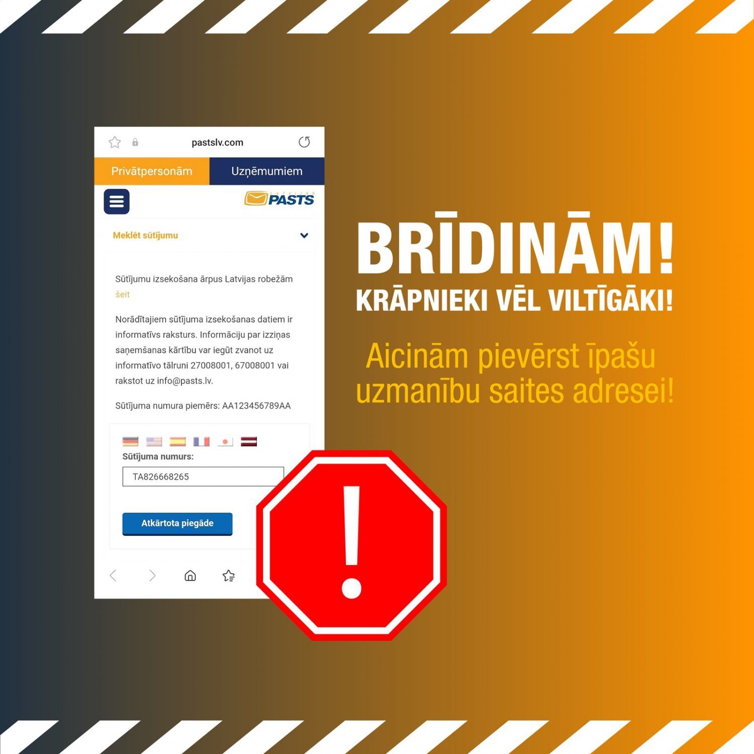 Latvijas Pasts brīdina, ka krāpnieki kļūst ar vien izdomas bagātīgi. Īsziņās pievienotā saite ir ļoti līdzīga Latvijas Pasta vietnes nosaukumam, tāpēc, ja rodas šaubas par saņemtās ziņas patiesumu, sazinies ar Latvijas Pasta Klientu centru 67008001, 27008001, info@pasts.lv vai raksti mums ziņu sociālo mediju lapās.