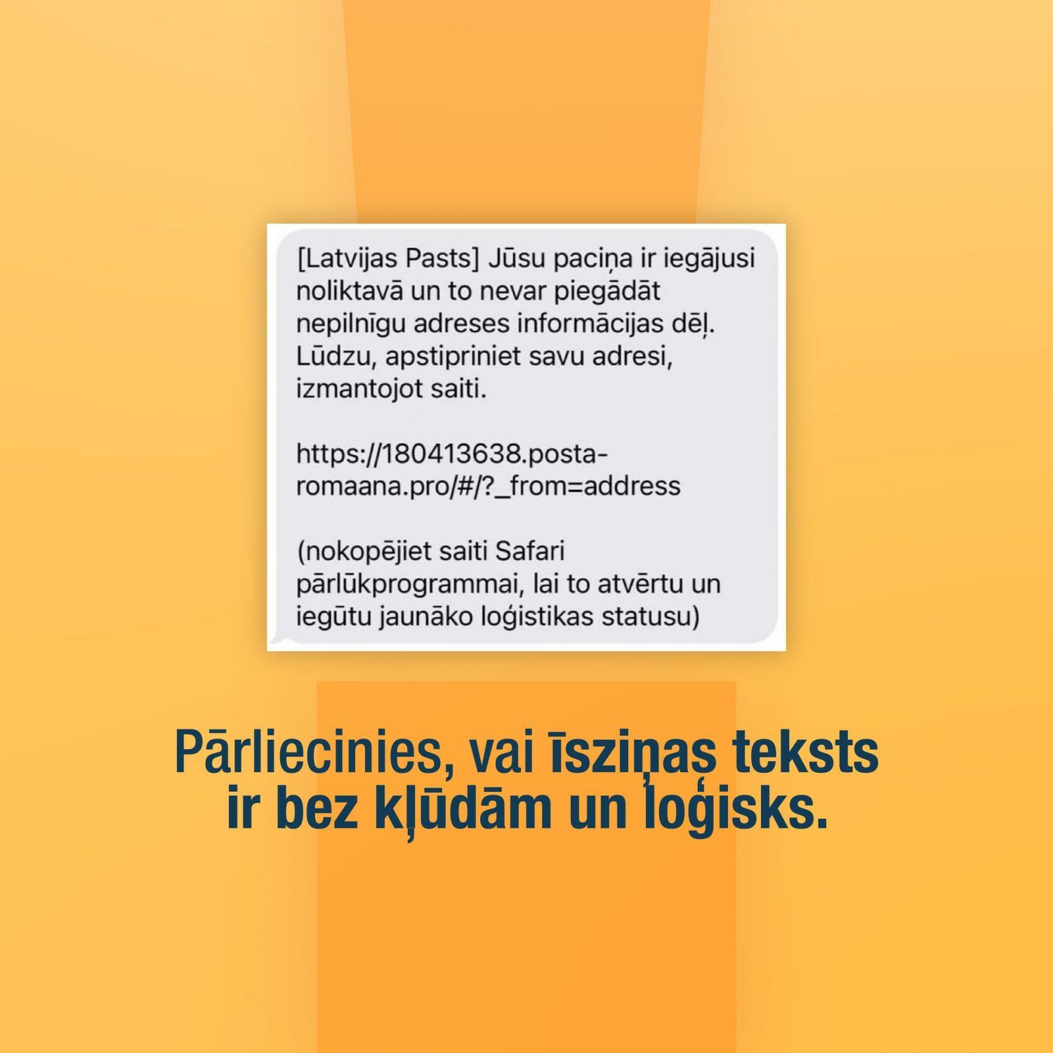 Līdz ar e-komercijas globālās iepirkšanās tuvošanos, kā arī gaidāmo svētku laiku, būtiski pieaug krāpnieku aktivitāte. Krāpnieki, izmantojot Latvijas Pasta zīmolu, arvien biežāk atrod jaunus veidus, viltus ziņu izplatīšanai, lai izkrāptu klientu personas datus finanšu līdzekļu ieguvei. Aicinām iedzīvotājus būt īpaši piesardzīgiem, neklikšķināt uz aizdomīgām saitēm, kā arī vienmēr piesardzīgi rīkoties ar personiskajiem datiem.