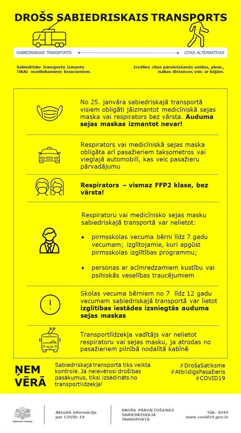 Lai nodrošinātu augstāku aizsardzību, no 25. janvāra sabiedriskajā transportā, taksometros un pasažieru komercpārvadājumos ar vieglo automobili visiem obligāti jāizmanto vismaz FFP2 klases respiratori bez vārsta (respiratori) vai medicīniskās sejas maskas. Auduma sejas maskas vairs nevarēs izmantot! Ārkārtējās situācijas laikā spēkā paliek visas iepriekš noteiktās drošības prasības.