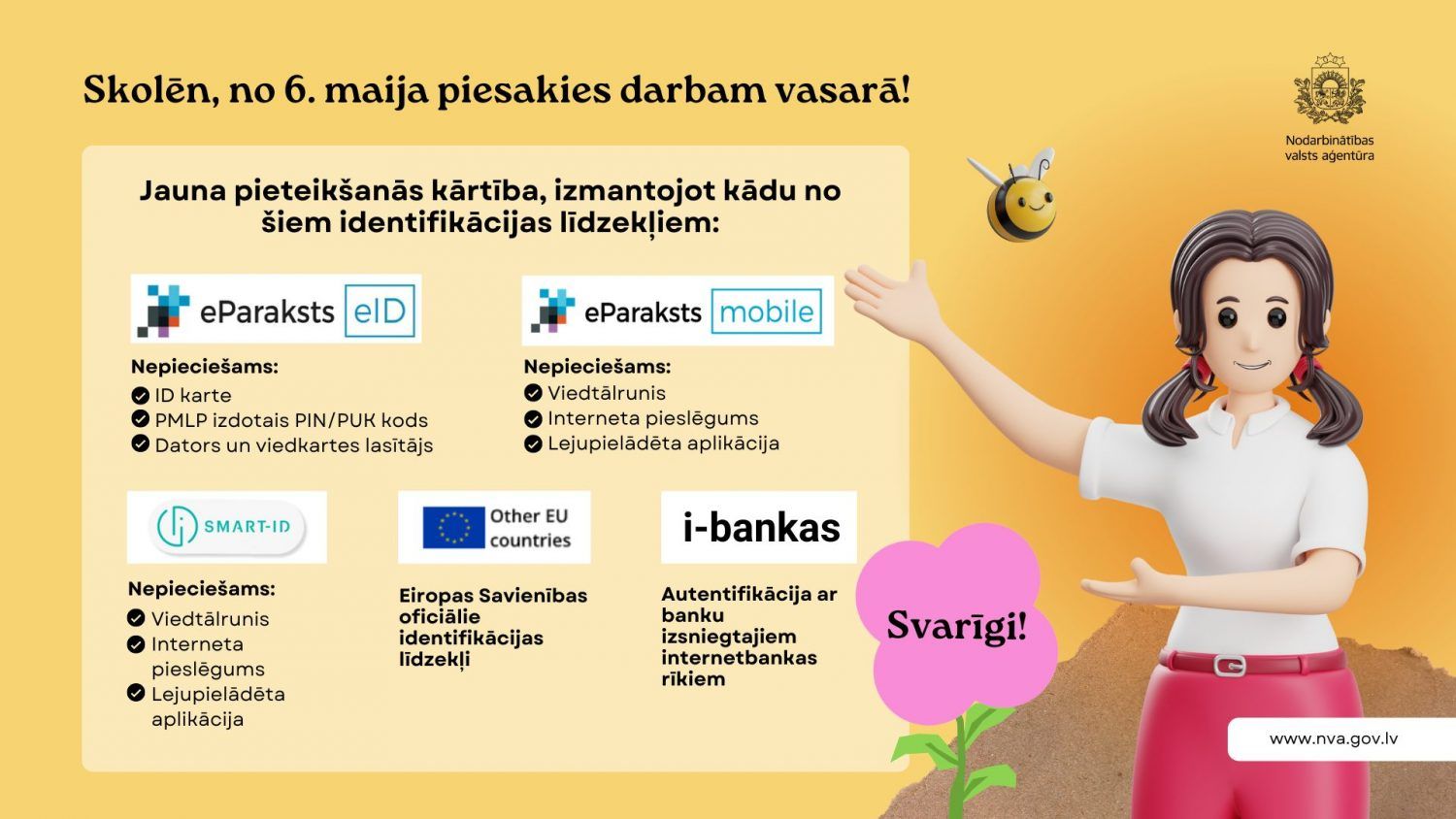 no 6. maijā pulksten 10.00 Nodarbinātības valsts aģentūra (NVA) uzsāks skolēnu elektronisko reģistrāciju dalībai vasaras nodarbinātības pasākumā. Pieteikties vasaras darbam skolēni varēs, autentificējoties NVA CV un vakanču portālā, izmantojot kādu no šiem identifikācijas līdzekļiem: