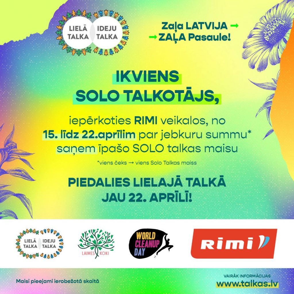 Lai tiem, kuriem labāk patīk talkot vienatnē vai ģimenes lokā, būtu ērtāk iesaistīties kopīgajā darbā, no 15. līdz 22. aprīlim (ieskaitot) būs iespēja saņemt savu SOLO talkas maisu Rimi veikalos. Jums tikai jāveic neliels pirkums par jebkuru summu un būsiet nodrošinājušies talkai. Viens iepirkuma čeks ir līdzvērtīgs vienam maisam. SOLO talkas maisu skaits gan ir ierobežots, tādēļ tos varēs saņemt Rimi hipermārketos, kā arī novados vai pilsētās, kurās ir tikai viens Rimi veikals, piemēram, Alūksne, Kuldīga, Saulkrasti, Cēsis u.c. Veikalu sarakstu, kuros būs iespējams saņemt maisus, atradīsiet šeit: https://www.rimi.lv/jaunumi/piedalies-lielaja-talka.