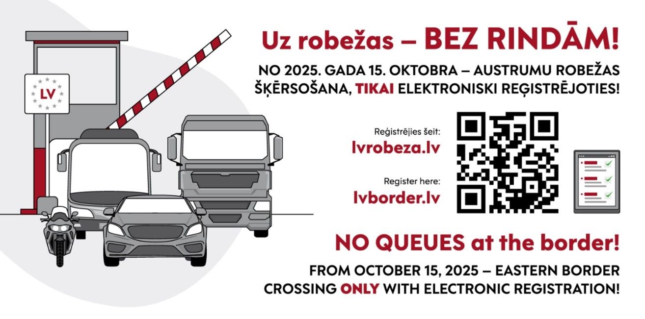No 2025. gada 15. oktobra transportlīdzekļi bez reģistrēšanās Elektroniskās rindas rezervācijas sistēmā šķērsot Latvijas Republikas austrumu robežu nevar – tas nozīmē, ka “dzīvajā” rindā šķērsot robežu vairs nav iespējams.
