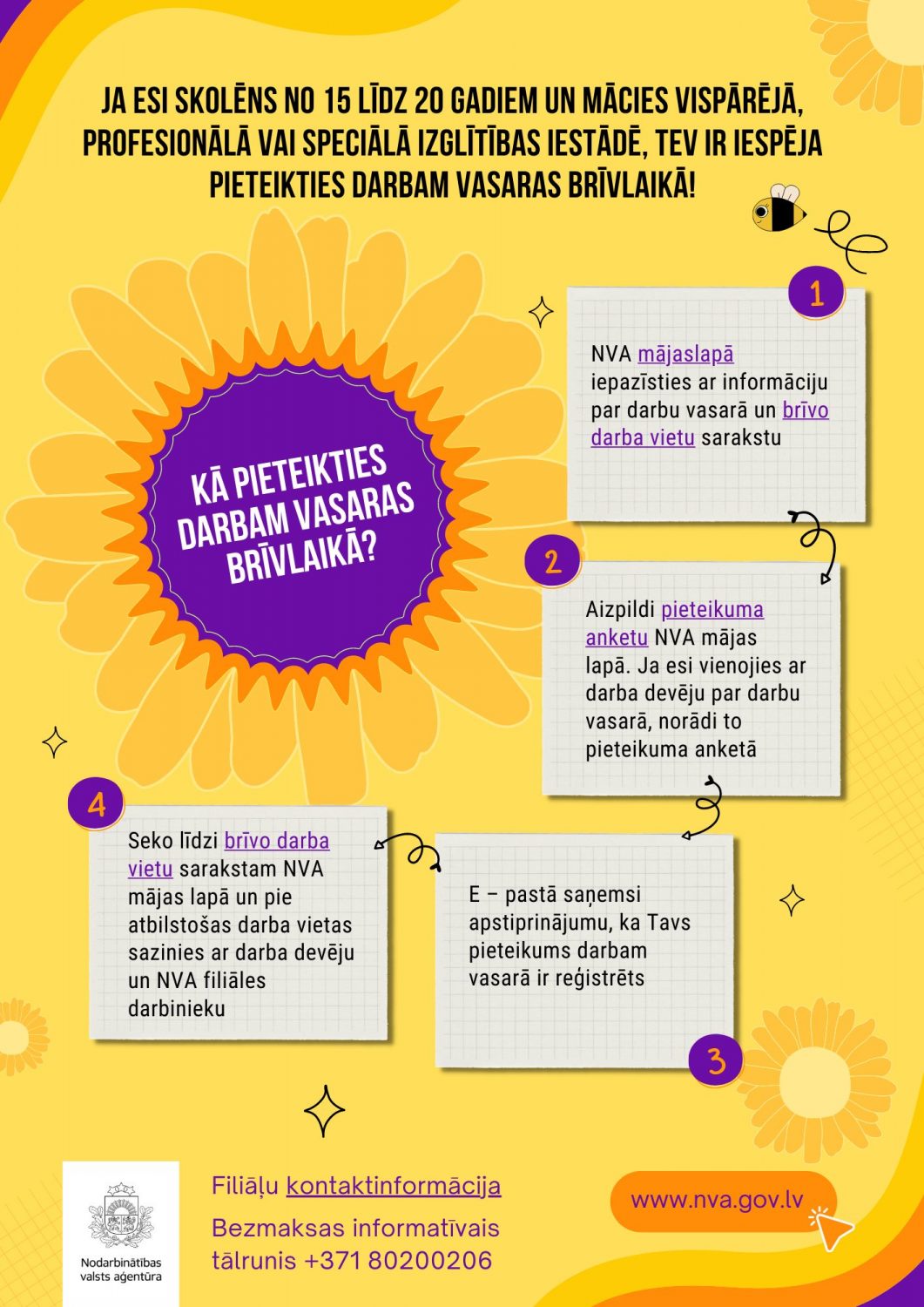 Aicinām skolēnus pirms reģistrācijas NVA mājaslapas sadaļā “Skolēnu vasaras darbs” iepazīties ar pasākuma aprakstu, nosacījumiem, skolēna un darba devēja pienākumiem un tiesībām. Ja rodas jautājumi, skolēns var sazināties ar darbinieku, kurš attiecīgajā NVA filiālē atbild par vasaras nodarbinātības pasākuma īstenošanu, atbildīgo darbinieku kontaktinformācija ir pieejama šeit: https://www.nva.gov.lv/lv/skolenu-vasaras-nodarbinatiba-skoleniem#ja-rodas-papildus-jautajumi-zvaniet-kontaktpersonai-kas-filiale-atbild-par-pasakumu.