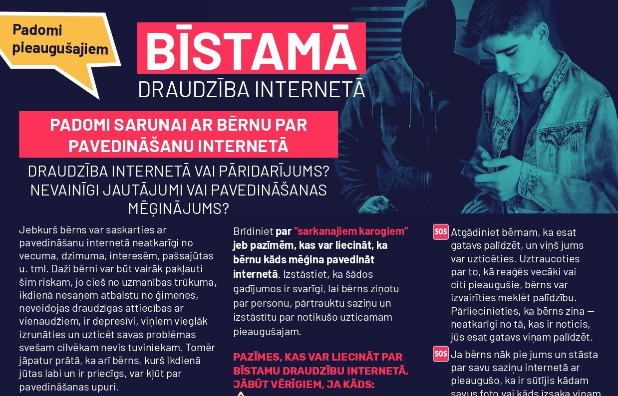 “Svarīgi, ka bērni būtu informēti par riskiem, kuri saistīti ar seksuāla rakstura noziegumiem interneta vidē. Tas palīdzētu bērniem atpazīt iespējamo apdraudējumu un nepieciešamības gadījumā bērni zinātu, kur vērsties pēc palīdzības. Tādēļ aicinu vecākus atkārtoti pārrunāt ar saviem bērniem drošus interneta lietošanas pamatprincipus,” aicina Dace Landmane.