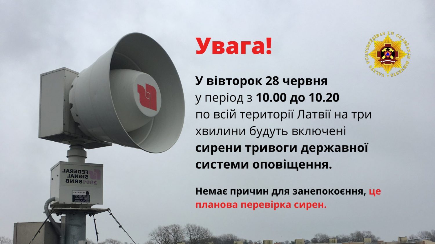 28.jūnijā no plkst.10.00 līdz plkst.10.20 visā valstī tiks iedarbinātas trauksmes sirēnas uz trim minūtēm. Iedzīvotājiem nav pamata uztraukumam, jo tā ir kārtējā trauksmes sirēnu pārbaude. Gadījumā, ja trauksmes sirēnu pārbaudes laikā tās nedzirdat, nesatraucieties, jo ārkārtas gadījumos, kur sirēnas nav dzirdamas vai izvietotas, var tikt izmantoti citi apziņošanas veidi, piemēram, informācijas nodošana sabiedrībai caur operatīvo dienestu un to sadarbības partneru skaļruņiem. VUGD aicina viesnīcu administrāciju informēt savus ārvalstu viesus par gaidāmo trauksmes sirēnu pārbaudi, lai nerastos lieki uztraukumi.