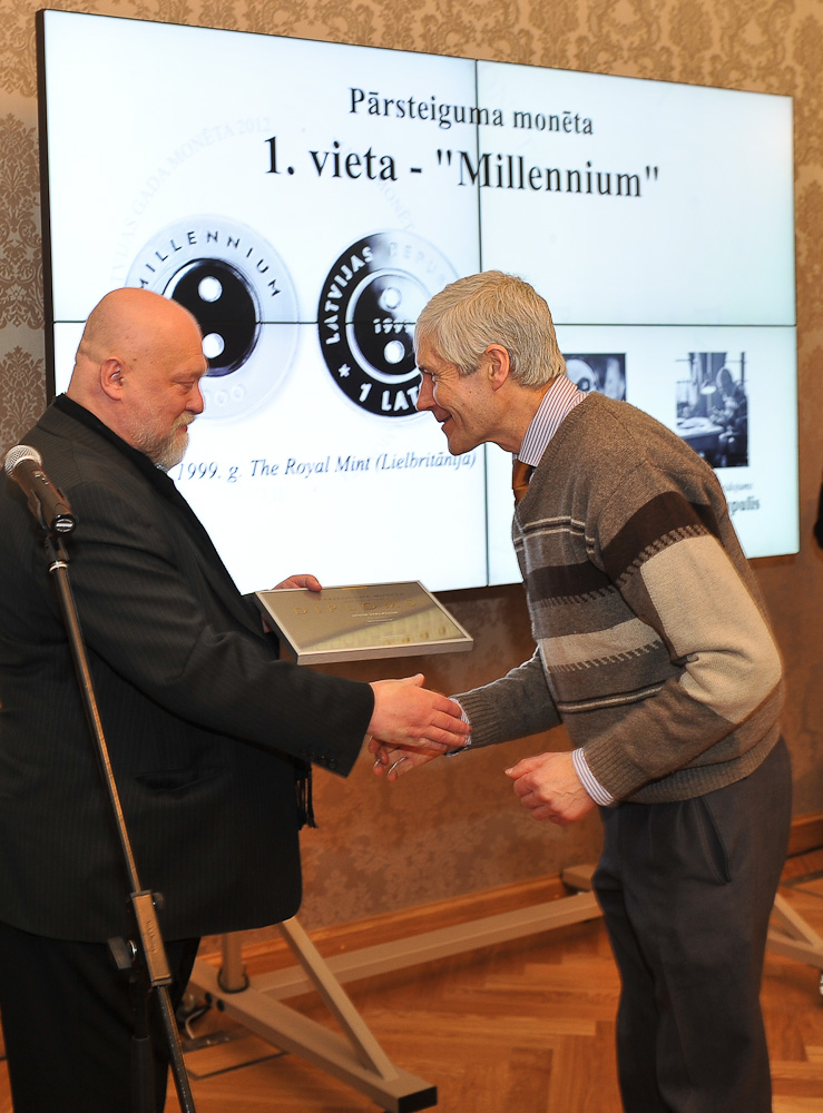 Šodien tika nosaukta arī gadskārtējā aptaujā noskaidrotā «Latvijas gada monēta 2012» – par to kļuva 2012. gadā atkārtoti nokaltais mākslinieka Riharda Zariņa «Sudraba pieclatnieks».