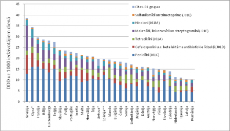 tomēr arī mūsu valsts iedzīvotājiem rezistence pret antibiotikām ir aktuāla problēma. Saskaņā ar ZVA statistikas datiem aptuveni 16 (2010.gadā – 14) no katriem 1000 Latvijas iedzīvotājiem 2011. gadā teorētiski ik dienas saņēma 1 terapeitisko sistēmiskai lietošanai paredzēto antibiotisko līdzekļu (ATĶ klasifikatora J01grupa) devu.