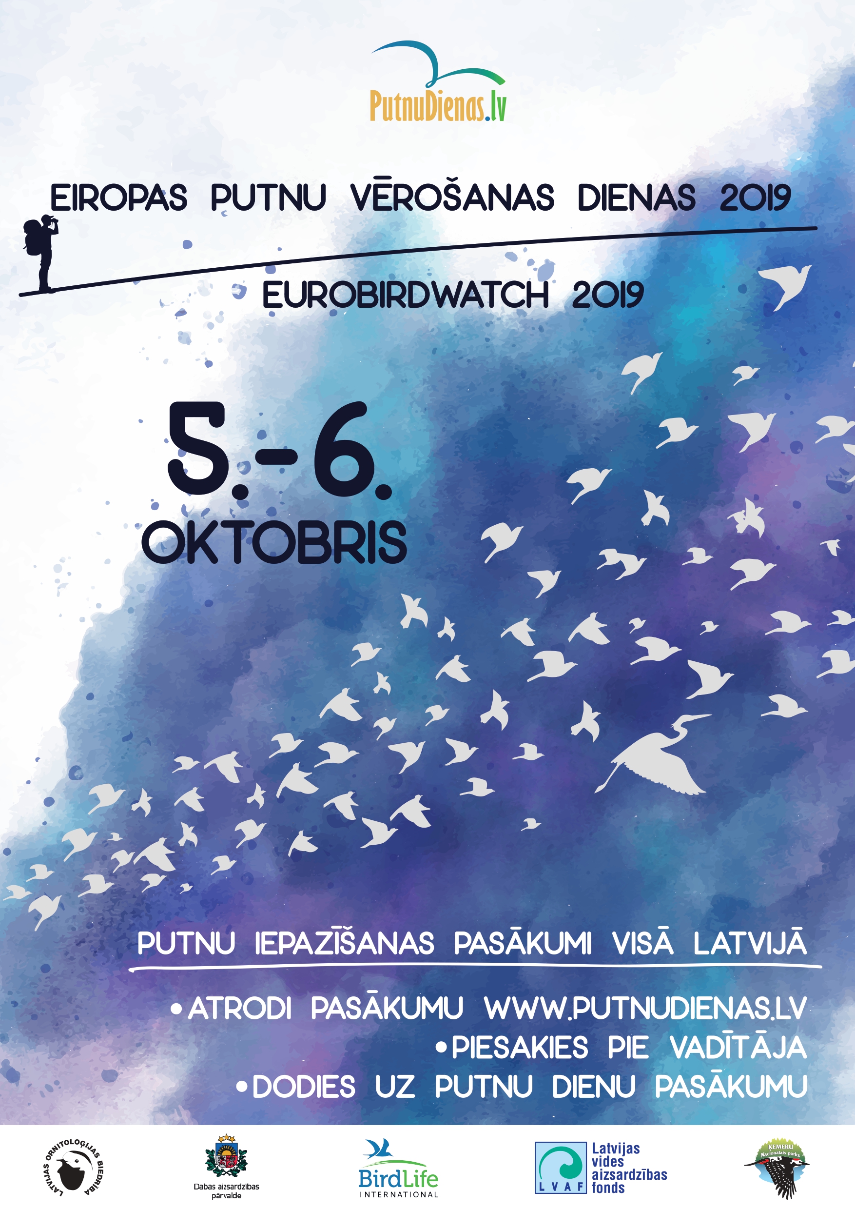 Aicinot ikvienu pievienoties putnu vērotāju pulkam vairāk nekā 40 Eiropas un Centrālāzijas valstīs oktobra pirmajā nedēļas nogalē, Latvijas Ornitoloģijas biedrība un Dabas aizsardzības pārvalde sadarbībā ar Latvijas Vides aizsardzības fondu un citiem partneriem izziņo gada spārnotāko pasākumu – Eiropas Putnu vērošanas dienas jeb «EuroBirdwatch 2019».