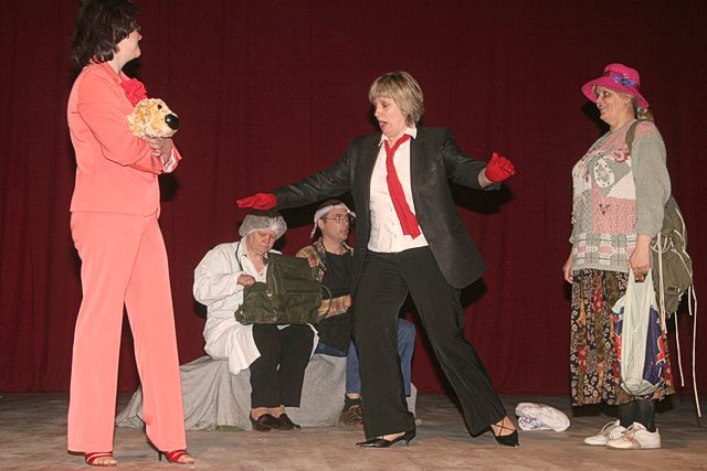 Kultūras nama zāle bija vaļā no divām ieejām un izejām ar'. Izrādes sekoja viena otrai piecu stundu garumā. Visas diemžēl neredzēju. Slampeniekus satiku tad, kad viņi jau savu lugu bija nospēlējuši un dekorācijas no nama laukā uz ielas bija iznestas. Pie dekorācijām bildējās Elīza lugā, dzīvē Baiba kopā ar Robertu uz skatuves un Normundu ikdienā. Kā un ko slampenieki spēlēja, neatstāstīšu. "Baiba, kālab teātri spēlē?!" "Pirms 15 gadiem iesāku. Bērni bija mazi un teātris bija labs iemesls, lai no mājas laukā izietu. Un tā no izrādes uz izrādi visu laiku," teic Baiba.