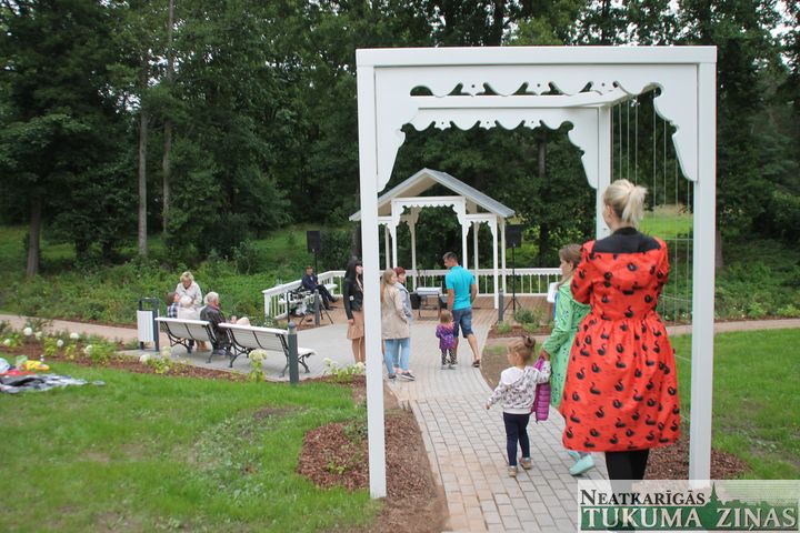 Atnākušos pie pašas ieejas gaidīja telts, kur, kā vēlāk noskaidrojām, «Engure Cafe» prasmīgākie kokteiļu jaucēji mudināja klātesošos vispirms nogaršot un pēc tam nobalsot par sev tīkamāko vasarīgo brūvējumu. Tā nu ar krāsainu dzērienu rokās kādu brīdi bija iespēja savā vaļā novērtēt parkā paveikto. Balti soliņi, norādes, kas vēstī, kurā virzienā un kādā attālumā atrodas citas ar jūrskolu saistītas vietas (piemēram, Valdemārpils, kas ir K. Valdemāra dzimtā vieta), smalkas, kokā grebtas arkas, kas, nokāpjot pa trepītēm, ved līdz tādos pašos toņos ieturētai terasei. Pirmā doma, kas pavīd, terasi lūkojot, ir nelielas, romantiskas laulību ceremonijas, kas te kaut kad nākotnē varētu notikt. Un, kā izrādās – ne velti tādas domas prātā šaujas! Saieta nama vadītāja Jolanta Kraukle atklāšanā pastāstīja, ka tieši tāda arī bijusi sākotnējā iecere, kad vēl tikai pārrunājuši, kādam būt un kam turpmāk kalpos parka iekārtojums. Un, kā tika solīts – tiem engurniekiem, kas kā pirmie sadomās izmantot šīs jaunradītās vietas priekšrocības, pati laulību ceremonija būšot bez maksas…