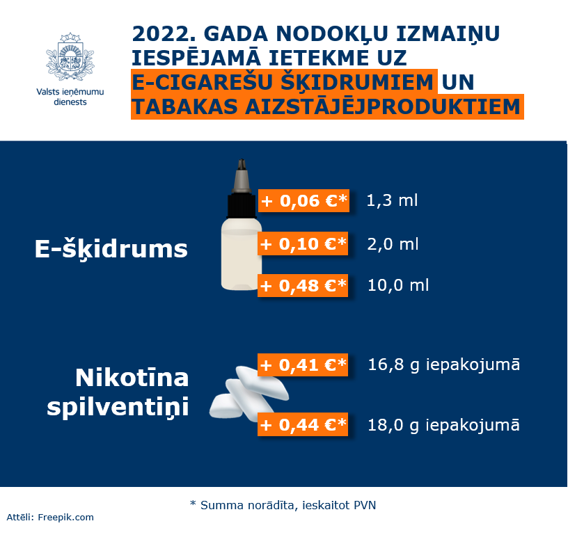 2022.gada 1.janvārī jāveic visiem e-šķidrumu un tabakas aizstājējproduktu apritē iesaistītajiem komersantiem (izņemot personas, kas saņēmušas speciālo atļauju (licenci) apstiprināta noliktavas turētāja darbībai), līdz 17.01.2022. jāiesniedz VID EDS akcīzes nodokļa starpības aprēķins un līdz 14.02.2022. jāsamaksā akcīzes nodokļa starpības summa par krājumā esošajiem e-šķidrumiem un tabakas aizstājējproduktiem.