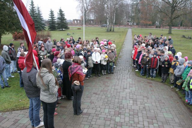 Vidusskolēni Lāčplēša dienā, 11. novembrī, nāk pie pieminekļa. Tā ir kā dzīva vēstures mācību stunda. Tā notika arī šodien. Gājiena priekšgalā – 12. klases audzēkņi Raitis Grasis, Anda Jēkabsonbe un Egita Ose ar valsts karogu rokās. Kopā nodziedāja Valsts himnu. Kultūras nama vadītāja Aija Ektermane un skolniece A. Jēkabsone pastāstīja par vectēviem un vecvectēviem, kuriem par godu piemineklis celts. Par viņu nopelniem Latvijas valsts tapšanā. Pieminekļa pakājē sagūla rudens ziedi. Aizdedza sveces, paklusēja un devās atpakaļ uz skolu.