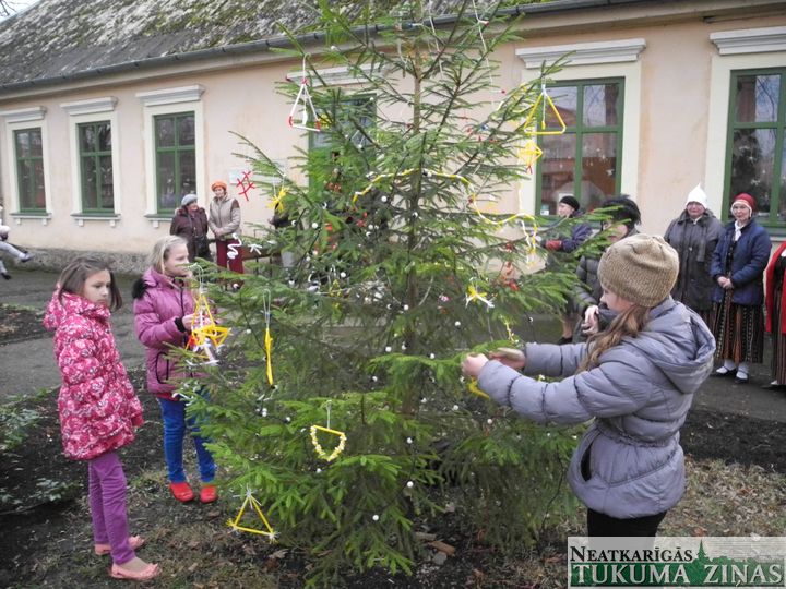 Saule uz garo ceļu rīt sāks iet. Džūksteniekiem prieks, ka gaisma atkal mājās. Piektdien, 20. decembrī, svinēt sāka. Ziemas saulgriežus ieskandēt palīdzēja Slampes folkloras ansamblis. Laukā pie Pasaku muzeja pušķoja egli ar pašu darinātiem košumiem.