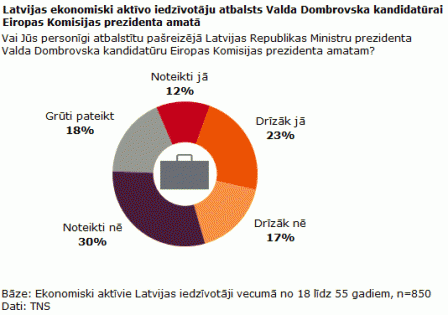 Puse (47%) Latvijas ekonomiski aktīvo iedzīvotāju vecumā no 18 līdz 55 gadiem neatbalstītu pašreizējā LR Ministru prezidenta Valda Dombrovska kandidatūru Eiropas Komisijas prezidenta amatam (30% – noteikti nē; 17% – drīzāk nē).