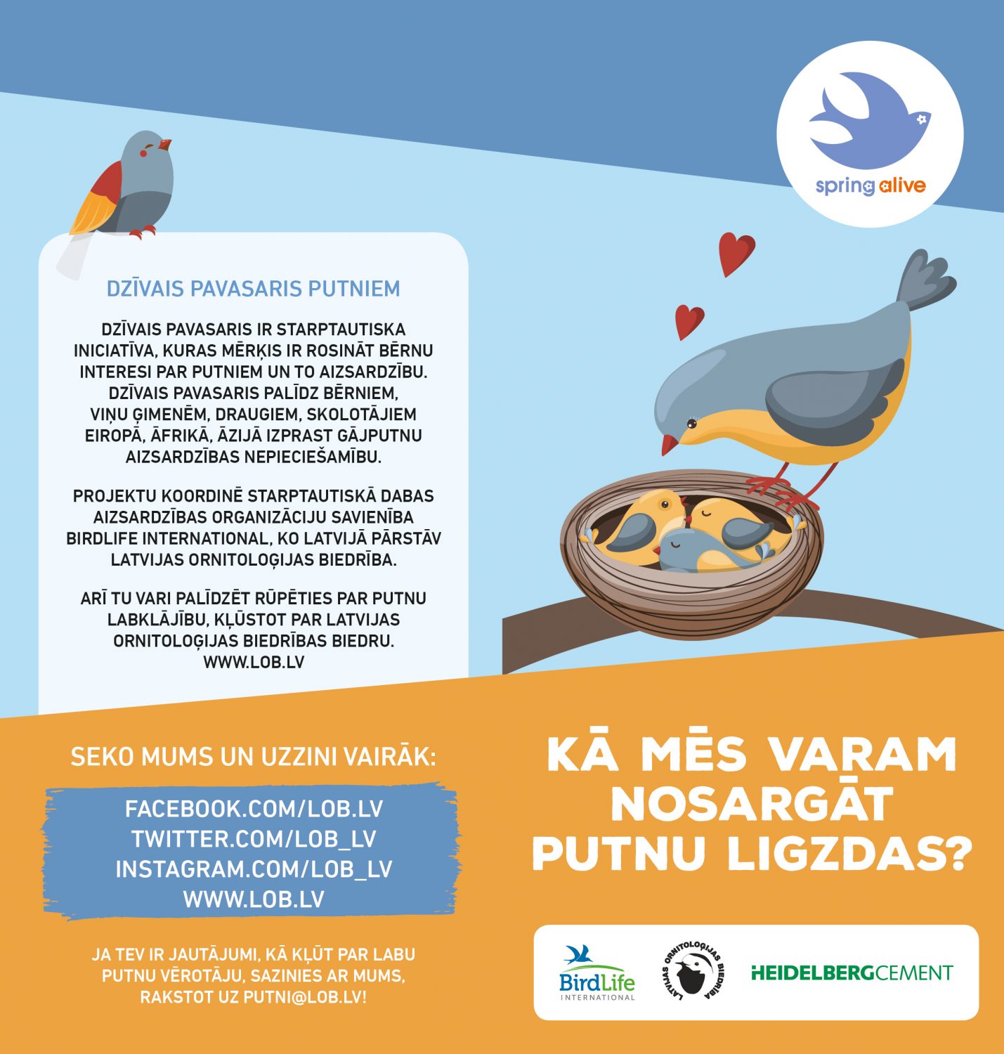 “Dzīvais pavasaris” ir starptautiska iniciatīva, kuras mērķis ir rosināt bērnos interesi par putniem un to aizsardzību, ļaujot piedzīvot putnu migrācijas burvību pašu acīm. Tas ir aicinājums bērniem, viņu ģimenēm, draugiem, skolotājiem vairāk nekā 50 valstīs Eiropā, Āzijā un Āfrikā ziņot par 7 gājputnu sugu – baltā stārķa, bezdelīgas, svīres, dzeguzes, bišu dzeņa, krastu čurkstes un smilšu tārtiņa – novērojumiem šeit: https://bit.ly/3bEDlFB . Programmas 2021. gada tēma ir putnu ligzdu drošība.