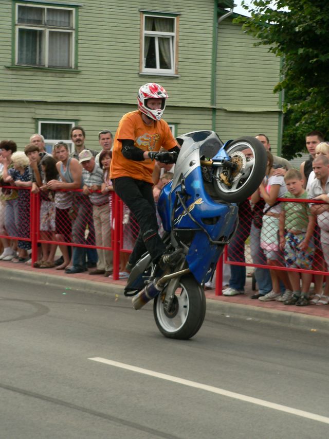 Daži gan līdz nožogotajai ielas daļai pie 3. vidusskolas neaizgāja – pārāk iespaidīgi un biedējoši bija tukumnieka Ata Gromova (Ača), rīdzinieku Daiņa Bērziņa (Skapja), Jedinaks Dudkina un cilvēka, kurš sevi sauc par Bigmenu, priekšnesumi: brauciens uz mocīša, stāvot kājās; griezieni ratā; brauciens ar paceltu mocīša priekšu vai pakaļu, strauja bremzēšana un galu galā – riepu nosvilināšana. Pēc šoviņa braucējus ieskāva sajūsminātu atbalstītāju un skatītāju pūlis, kas fotografējās pie un uz mocīšiem. Paši šovmeņi gan bija tā kā nobažījušies – vai patika, vai nebija par īsu? Jo, nelaime viena – ieskriešanās ceļš un arī trasītes platums mototrikiem tomēr bija mazliet par mazu, pārāk daudz apkārt bija bērnu, arī tādu, kurus, kā šķita, neviens arī tā īsti nepieskata.