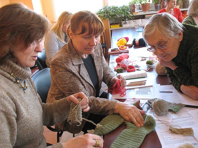 Kad aizgājām apskatīties, ko skaistu kursa dalībnieces sašuvušas, izrādījās, ka viņas nevis šuj, bet ada, turklāt paraugam noliktais zeķu pāris gan pēc formas, gan izmantotās tehnikas vedināja domāt par kādas senas tehnikas apgūšanu.
