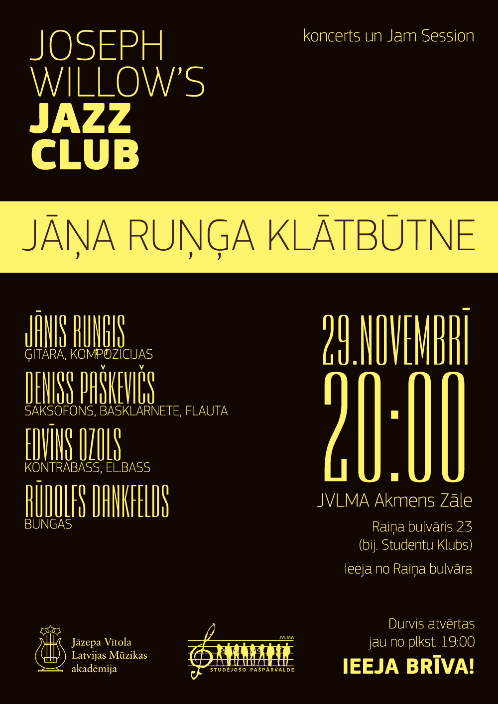 Ceturtdien, 29. novembrī, 20.00 «Joseph Willow’s Jazz Club» ietvaros džeza mūzikas draugi aicināti viesoties projekta «Jāņa Ruņģa Klātbūtne» koncertā, kas noritēs Jāzepa Vītola Latvijas Mūzikas akadēmijas Akmens zālē, Raiņa bulvārī 23. Pēc koncerta notiks jam session, kurā piedalīties tradicionāli tiek aicināti visi interesenti.