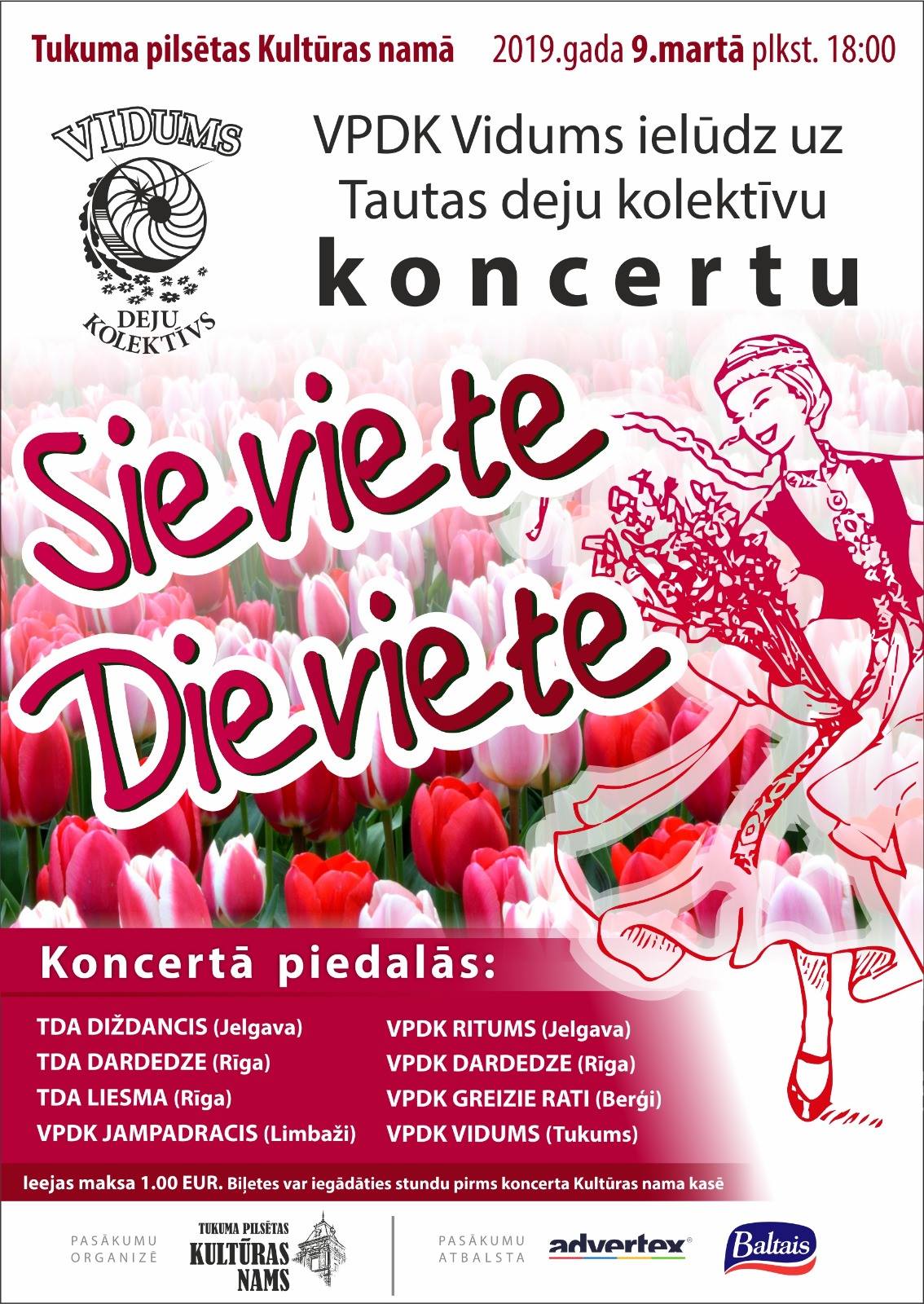 Sieviešu dienas svinības mūspusē turpināsies ari sestdien, 9. martā. Tukuma pilsētas Kultūras namā sestdien, pulksten 18.00 Vidējās paaudzes deju kolektīva «Vidums» nu jau tradicionāli aicina uz tautas deju kolektīvu koncertu «Sieviete Dieviete». Koncertā piedalīsies kolektīvi no Jelgavas, Rīgas, Berģiem, Limbažiem un Tukuma.