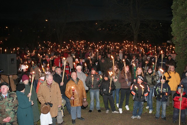Lāpu gājienam ļaudis pulcējās pie tā sauktās partijas mājas. Brīdi pirms gājiena visa pilsēta it kā pieklusa. Un tad, bungām rībot, ļaudis ar lāpām rokās kā koša lente aizlocījās pa Meža ielu. Gājienā – raibu raiba publika: vectēvi, vecāsmātes, kungi, kundzes, jaunskungi, meitenes un daudzi ratiņos dusoši mazuļi. Visi kopā – pārsimts metru garā lentē. Ļaudis ar lāpām rokās stāvēja arī ielas malā. Vieni pievienojās, citi palika stāvam.