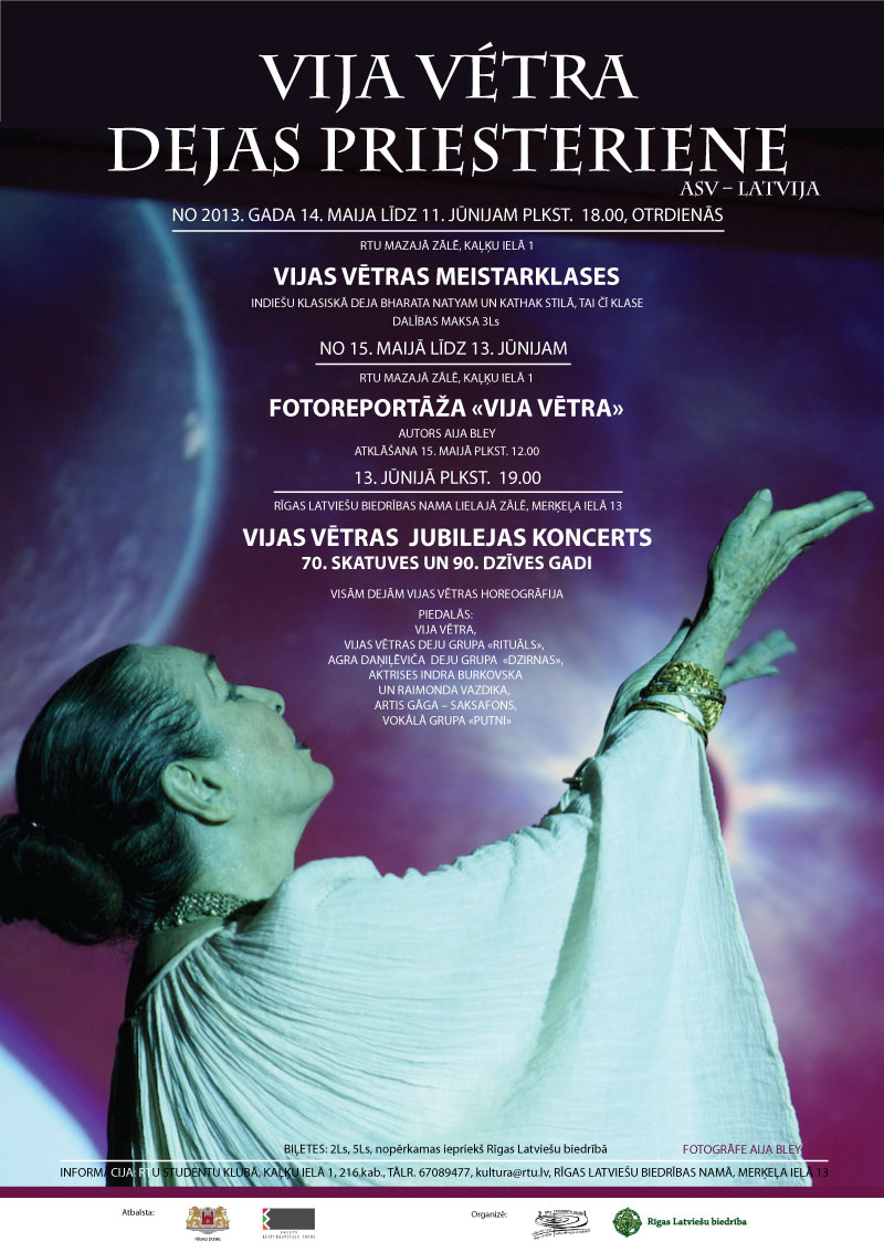 No 14. maija līdz 13. jūnijam Rīgas Tehniskās universitātes (RTU) Mazajā zālē (Kaļķu ielā 1, Rīgā) norisināsies indiešu klasisko deju meistarklases, ko vadīs pasaulē pazīstamākā latviešu izcelsmes šo deju izpildītāja, horeogrāfe, lektore un pedagoģe Vija Vētra. Turpat arī būs skatāma Latvijas kinorežisores un producentes Aijas Bley fotoreportāža «Vija Vētra».