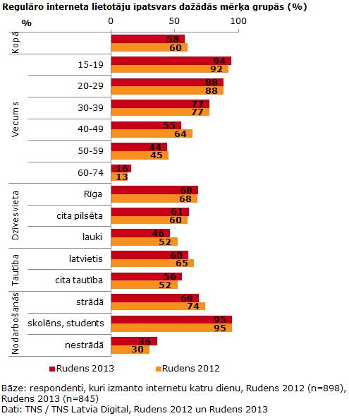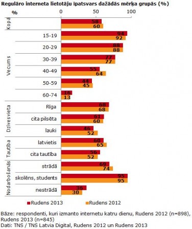 TNS mediju pētījumu vecākā klientu vadītāja Signe Hokonena norāda, ka regulāro interneta lietotāju skaits saglabājies stabils visās iedzīvotāju vecuma grupās, bet samazinājies to Latvijas iedzīvotāju vidū, kas ir vecumā no 40 līdz 49 gadiem. Internetu katru dienu šajā rudenī izmantojuši 55% iedzīvotāju vecumā no 40 līdz 49 gadiem, kas ir par 9 procentpunktiem mazāk nekā pirms gada. Analizējot interneta lietošanas izplatību pēc citiem sociāli – demogrāfiskajiem parametriem, redzams, ka salīdzinoši straujāks regulāro interneta lietotāju īpatsvara pieaugums vērojams citas tautības, kā arī nestrādājošo iedzīvotāju vidū, bet samazinājies latviešu, strādājošo, kā arī lauku iedzīvotāju vidū.