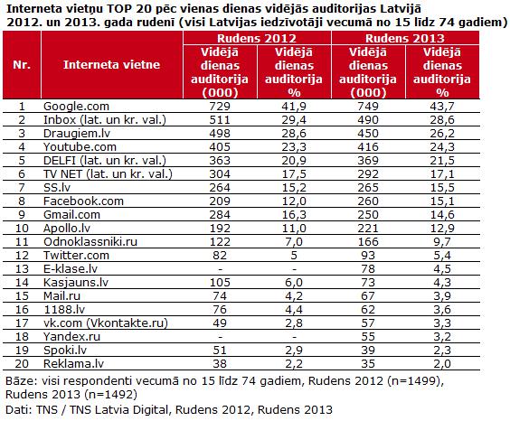 Jaunākie pētījuma rezultāti liecina, ka joprojām visapmeklētākā interneta vietne pēc vidējās vienas dienas auditorijas rādītājiem Latvijas iedzīvotāju vidū vecumā no 15 līdz 74 gadiem ir Google, kuru vidēji dienā apmeklē 43,7% jeb 749 tūkstoši Latvijas iedzīvotāju. Otrajā vietā ar 28,6% jeb 490 tūkstošiem lielu auditoriju ierindojas e-pastu serveris Inbox, bet trešo vietu ieņem sociālais tīkls Draugiem.lv ar 26,2% jeb 450 tūkstošiem.