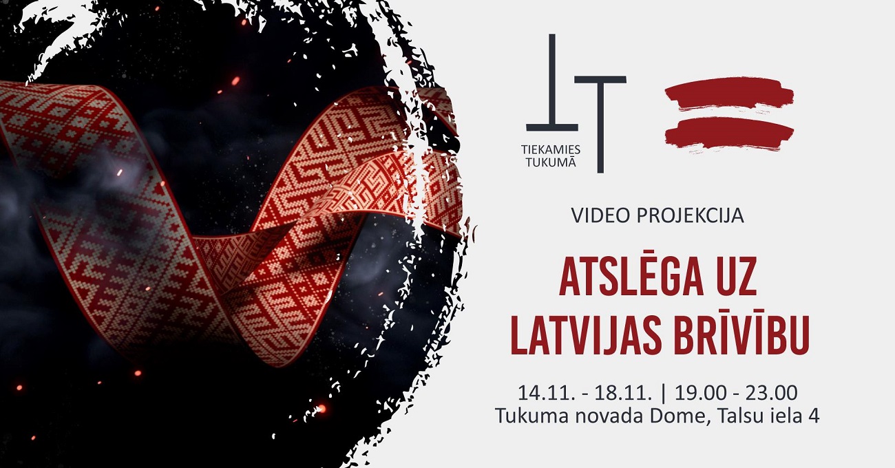 Lai svinētu Latvijas dzimšanas dienu kopā, bet droši, no sestdienas, 14.novembra līdz 18.novembrim uz Tukuma novada Domes ēkas fasādes būs skatāma video projekcija ATSLĒGA UZ LATVIJAS BRĪVĪBU. Atslēga uz Latvijas brīvību autoruplāt, ir ne vien brīvības cīnītāji, tauta, zeme, karogs un mīlestība pret savu valsti, bet arī laiks, ko atslēdzam un veltām sevis izpratnei. Projekcija ir tās veidotāju redzējums par Latviju un patriotismu, ļaujot skatītājiem piedzīvot emocionālu sasaisti ar mūzikas un vizuālo baudījumu. Ja dosities vakara pastaigā pa pilsētu, tad iekļaujiet domes ēku kā vienu no punktiem, ko apskatīt, jo projekcija būs skatāma visas šīs dienas uz sienas no pulksten 19.00 līdz 23.00. Adrese: Tukuma novada Domes ēkas fasāde, Talsu iela 4, Tukums.
