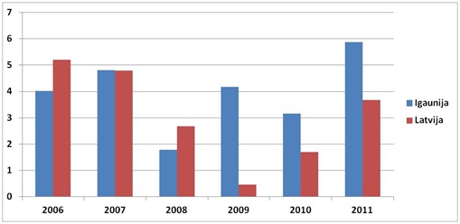 Tagad pievērsīsimies praktiskiem piemēriem un paskatīsimies uz mūsu kaimiņiem igauņiem, kuri eiro ieviesa ar 2011. gada 1. janvāri. Jau gadu pirms eiro ieviešanas (kad kļuva zināms, ka eiro Igaunijā tiks ieviests) bija novērojams būtisks ĀTI pieaugums. Savukārt eiro ieviešanas gadā (2011) ĀTI apjomi pieauga gandrīz dubulti. 1. attēlā redzama Latvijas un Igaunijas ĀTI (neņemot vērā finanšu sektoru, kam raksturīgs augsts datu svārstīgums) dinamika, kas izteikta procentos no iekšzemes kopprodukta. Kā redzams, tieši 2011. gadā Igaunijas tautsaimniecība spēja piesaistīt būtiski lielāku ĀTI apjomu nekā iepriekš.