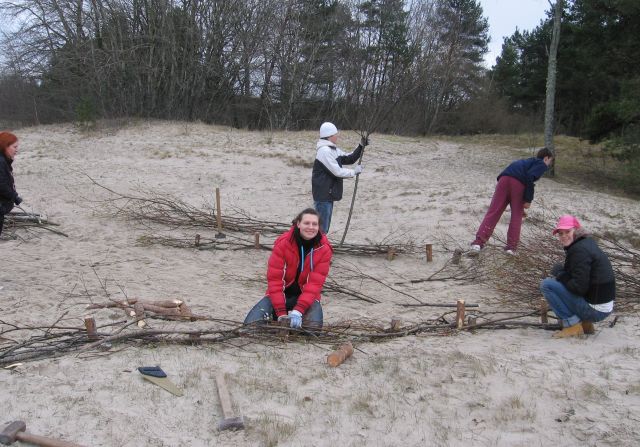 Izgājuši cauri interesantam priežu biotopam ar vecām žuburainām priedēm, kurās mājvietu rod putni, šķērsojot kāpu, nonācām pludmalē, no kuras redzams, kā skolēni izbradātās stāvās kāpas nogāzes nostiprināja ar kārklu pinumiem un stādījumiem. Cita skolēnu grupa strādāja Plieņciema Baltajā kāpā. Šie paši skolēni jau agrāk gar Balto kāpu – gar taku uz pludmali – bija veidojuši zaru pinumus. Kārklu zarus kāpu nostiprināšanai ņem no tuvējiem kāpā augošajiem kārkliem, kurus apgriež. Tie savukārt turpmāk augs kuplāki un kopā ar jaunajiem pinumiem vēl labāk aizturēs vēja nestās smiltis, lai tās netiktu pūstas tālāk ciema virzienā. Ar pinumiem iezīmējot taku malas, domāts organizēt atpūtnieku plūsmu.