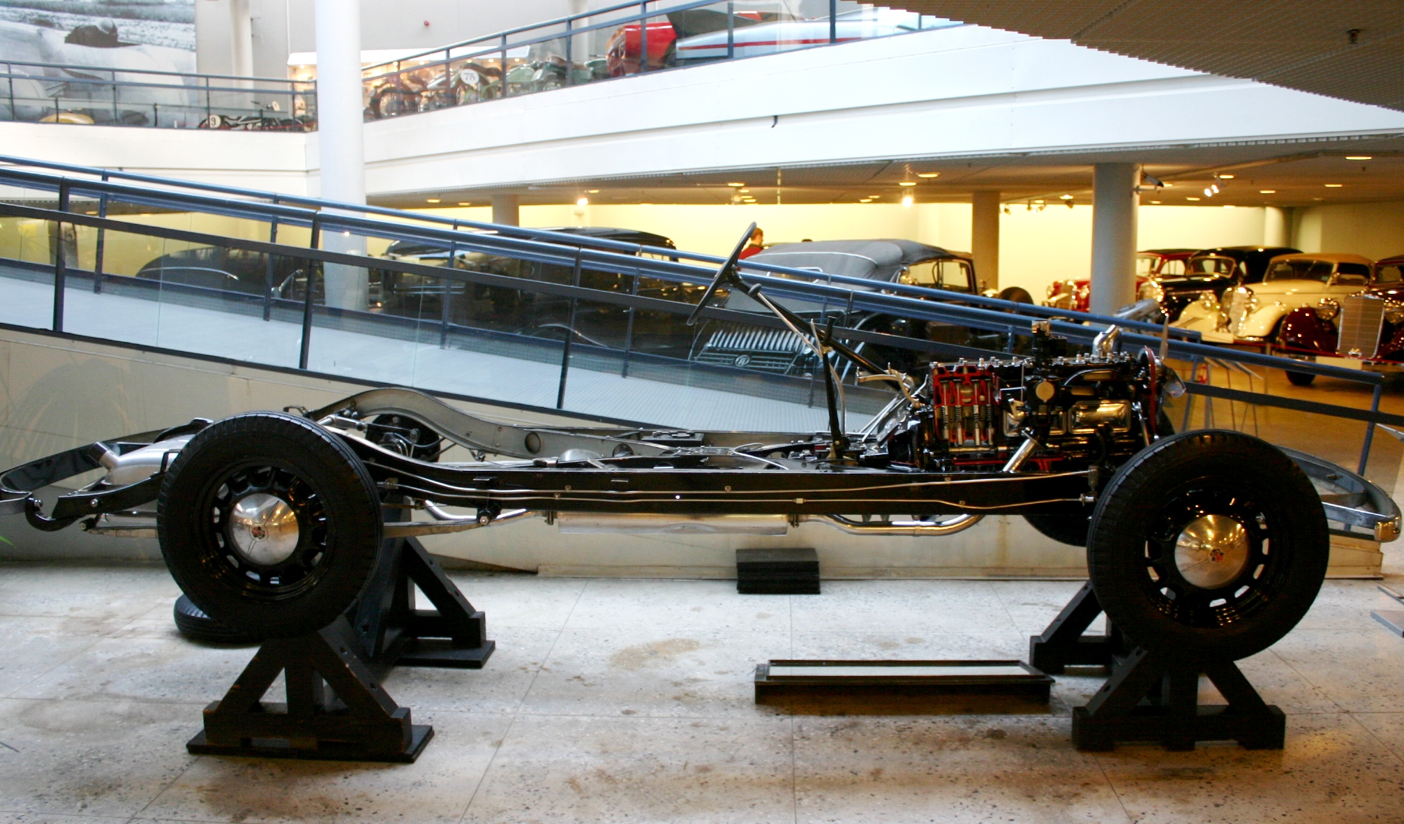 Šasijas agregātiem demonstrācijas nolūkos ir izgriezti un iekrāsoti agregātu un detaļu fragmenti, tādejādi skatītājam atsedzot dzinēja, transmisijas un ritošās daļas uzbūves principus, kas citkārt nebūtu redzami. Jāpiebilst, ka šasija ir neticami labi saglabājusies, ieskaitot pat oriģinālās 1934.gada riepas. Pirms eksponēšanas tai nācās veikt tikai nelielu kosmētisku remontu un riepu kameru nomaiņu.