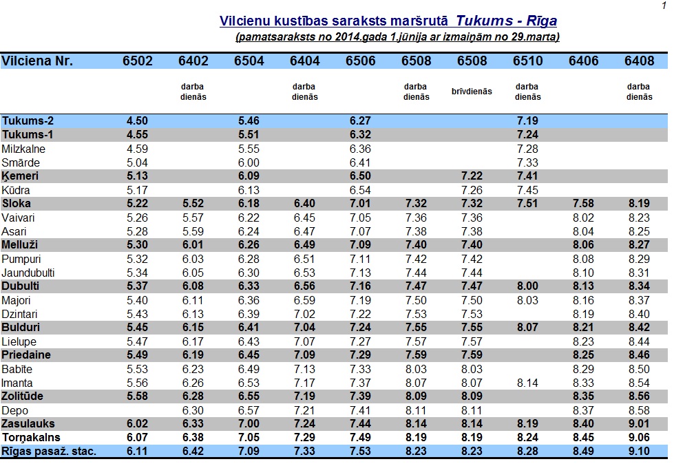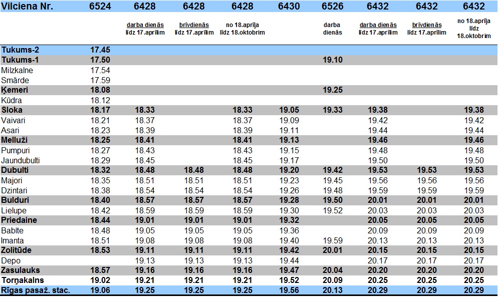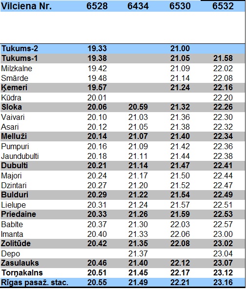 Vilciens Rīga (20.16)-Tukums-1 (21.34) no Rīgas aties 20.25, no visām pieturām kursēs 8 – 9 min. vēlāk un neapstāsies Kūdrā. Tukumā-1 pienāks 21.42.