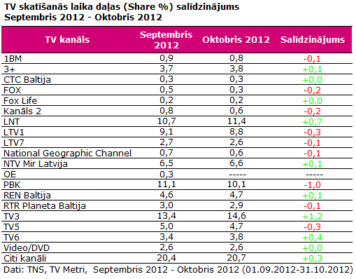 Pētījumu aģentūra «TNS» apkopojusi 2012. gada oktobra TV kanālu auditorijas.