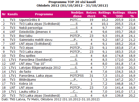 Oktobra skatītāko TV programmu topa pirmajā vietā ierindojies seriāls «UgunsGrēks 8» kanālā «TV3», kuru vērojuši vidēji 10,2 % jeb 205,9 tūkstoši Latvijas iedzīvotāju, kas vecāki par 4 gadiem. Programmu topa otrajā vietā ierindojušās «TV3 Laika ziņas» (svētdienā) kanālā «TV3», kuras vērojuši vidēji 10,1 % jeb 205,5 tūkstoši skatītāju. Savukārt trešā skatītākā programma oktobrī – «Nekā personīga» kanālā «TV3», kuru vērojuši vidēji 9,7 % jeb 196,7 tūkstoši Latvijas iedzīvotāju, kas vecāki par 4 gadiem.