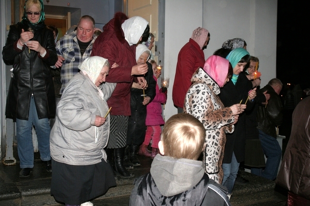 "Kristus ir augšāmcēlies", Tukuma sv. Nikolaja pareizticīgo draudzei un svētbrīdī klātesošajiem pavēstīja mācītājs Tēvs Joans. Dievkalpjums notika pusnaktī no sestdienas uz svētdienu. Ļaudis aizlūdza par Kristus ciešanām. Svētku procesija trīs reizes apgāja apkārt dievnamam. Viens otru sveica. Sev līdzi uz mājām aiznesa pasvētītos ēdienus un dzērienus.