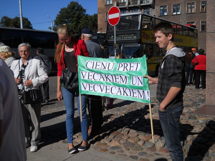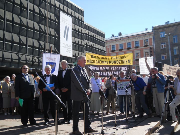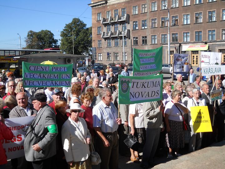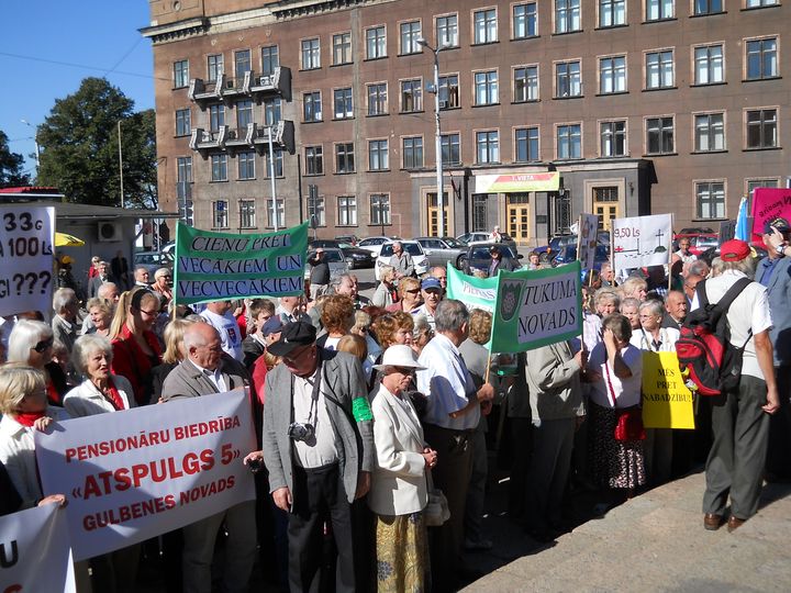 Tāds uzraksts šodien, 7. septembrī, bija lasāms uz plakāta pie Strēlnieku pieminekļa Rīgā, kur pulcējās apmēram tūkstotis Latvijas pensionāru un viņu atbalstītāju, lai stundas laikā paustu savas prasības valdībai un Saeimai. Sapulce sanāca diezgan skaļa un notikumiem bagāta, jo seniori ne tikai emocionāli prasīja savas laimīgās vecumdienas, bet arī atklāti pauda dusmas pret labklājības ministri, savukārt kāda pensionāre tik kaismīgi gribēja runāt par visu, ka organizētāji bija spiesti raidīt viņu prom no mikrofona gan ar uzstājīgiem lūgumiem, gan ar staltu puišu pieaicināšanu talkā.
