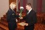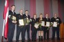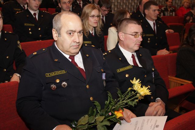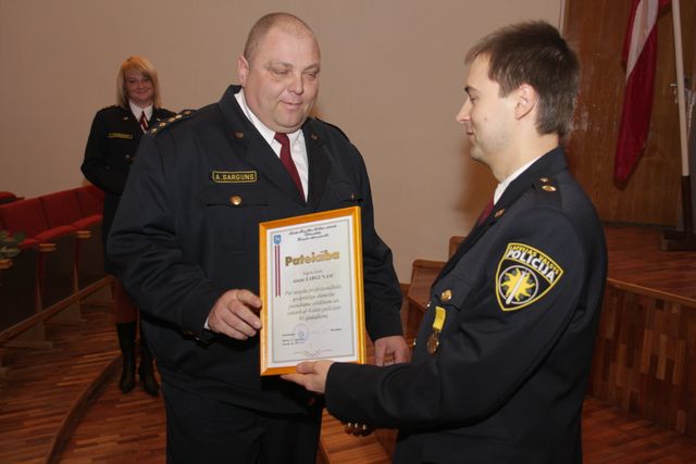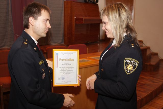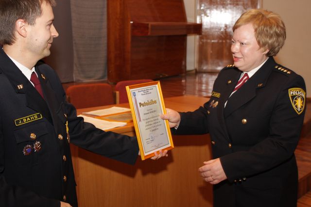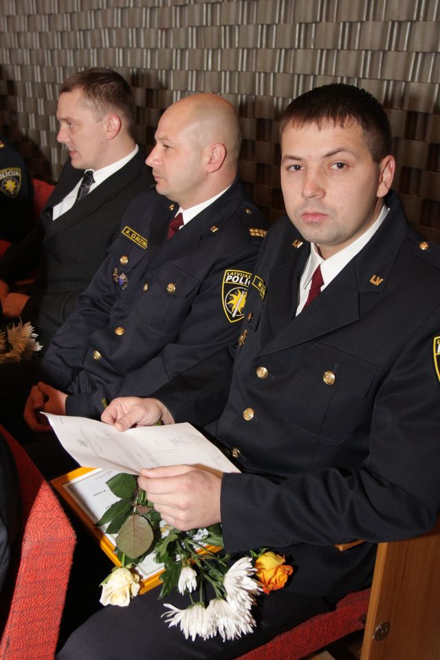Klātesošie ar ziediem un aplausiem sveica Zemgales reģiona policijas pārvaldes pateicības saņēmējus: Jāni Siliņu (attēlā no kreisās). Daini Čepuli, Māri Trēdi, Rolandu Beberi, Santu Dedilu, Sandri Stemperu un Aini Sargunu. Ar Iekšlietu ministra pavēli dienesta pakāpes paaugstinātas Romekam Fabjančikam, kas nu ir pulkvežleitnants, Mārim Trēdem, Andrejam Petrovam un Jānim Kundziņam, kas nu ir policijas kapteiņi. 27 policijas darbinieki saņēma krūšu nozīmes par 5 līdz 25 gadu izdienu. Krūšu nozīmju īpašniekus J. Bahs nolasīja no papīra. Nozīmes vēl neesot izgatavotas.