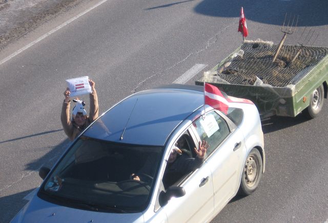 Mūsu rajona zemnieki devās uz Liepājas šosejas un Rīgas apvedceļa krustojumu. Šeit bija sapulcējušies protestētāji no Liepājas, Saldus, Talsiem, Ventspils un Tukuma rajoniem. Ceļmalā iekurināts ugunskurs, pie kura sildīties. Gluži kā barikāžu laikā. Vispirms akcijas dalībnieki stājās ierindā un ar mašīnām un traktoriem devās pa apvedceļu Mārupes virzienā. Tikuši gandrīz līdz krustojumam ar Jelgavas šoseju, spēka rati tika apgriezti braukšanai pretējā virzienā. Tādējādi kādu laiku viena traktoru un automašīnu kolonna brauca pretī otrai. Uz daudziem traktoriem bija uzraksti: «Nost ar Rozi», «Mēs nelūdzam, bet prasām», «Ļaujiet mūsu govīm dzīvot» un citiem. lauksaimniekiem netrūka atbalstītāju. Tie, kurus kolonnas traucēja, neturēja ļaunu prātu, bet gan garāmbraucot māja ar rokām, signalizēja, tādējādi paužot atbalstu. No Ķekavas apļa saņēmta ziņa, ka tas bloķēts pilnībā, tad no Bauskas puses tam tuvojās kolonna ar apmēram 100 traktoriem. Tad Ķekavas krustojums tika atbrīvots un protestētāji devās Salaspils virzienā. Pa to laiku lauksaimnieki no Kurzemes atkal tuvojās Rīgas apvedceļa un Liepājas šosejas krustojumam, kur nobraukuši uz Liepājas šosejas apstājas, lai ieturētu pusdienas un, sildoties pie ugunskura, sāktu gaidīt, kādu lēmumu sēdē pieņems valdība. Mūsu rajons bija plaši pārstāvēts: bija zemnieki no Sēmes, Smārdes, Zemītes, Džūkstes, Slampes un citiem pagastiem. Leons Veidemanis neesot zemnieks, taču zemnieka darbu dara, jo strādā SIA «Kalnāji». Viņš ieinteresēts, lai zemnieki un piensaimniecība izdzīvo tāpēc, ka strādā šajā nozarē un no viņa darba atkarīga viņa ģimenes labklājība. SIA «Kalnāji» modernizējis ražošanu, domājis un strādājis attīstībai, ieguvis konkursa «Sējējs» atzinību, taču pašreizējā situācija piensaimniecībā neļauj nozarei izdzīvot. Un tā savs stāsts stāstāms katram no akcijas dalībniekiem.