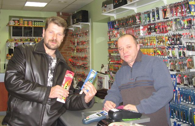 Attēlā: Veikalā «Zīles makšķerlietas» pārdevējs Aleksandrs Kolkāns sveic lieliskā oktobra loma īpašnieku Māri Ošķi.