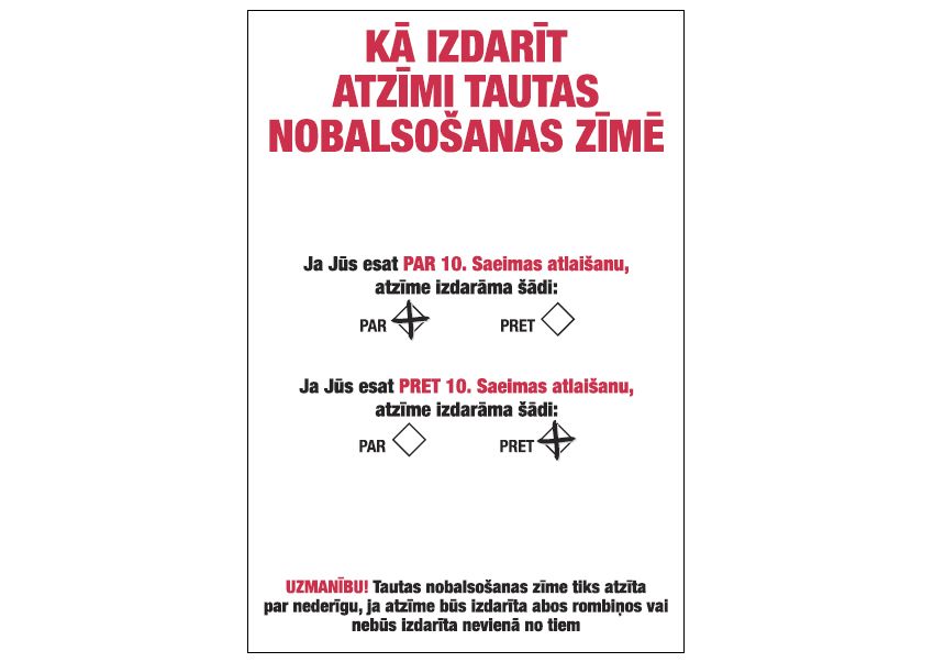 – Tautas nobalsošanā mums – vēlētājiem jāatbild uz jautājumu “Vai Jūs esat par 10. Saeimas atlaišanu?". Iespējamie atbilžu varianti tautas nobalsošanas zīmē ir “par" vai “pret". (Jāievelk viens krustiņš izvēlētajā laukumā!)