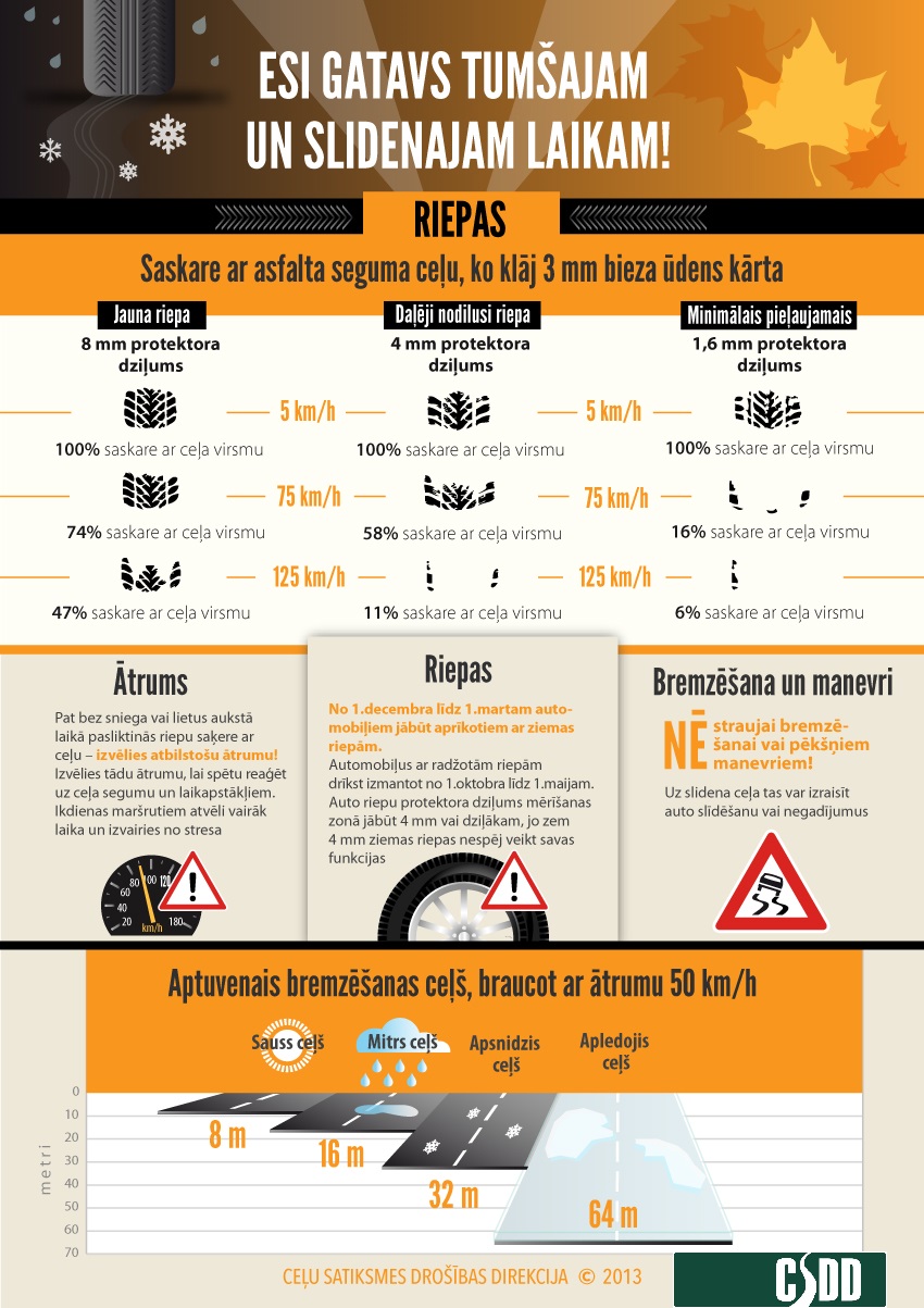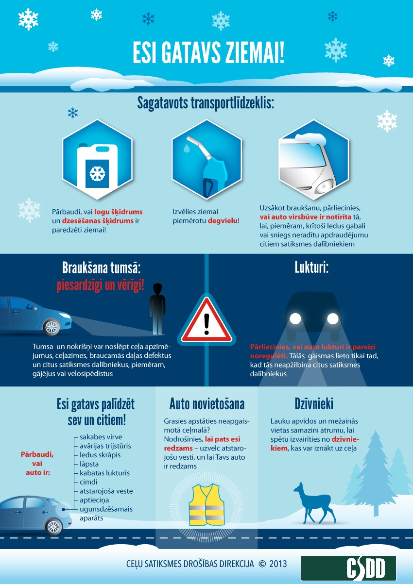 Vairāk par sagatavošanos braukšanai ziemā var uzzināt CSDD infografikos «Esi gatavs tumšajam un slidenajam laikam»